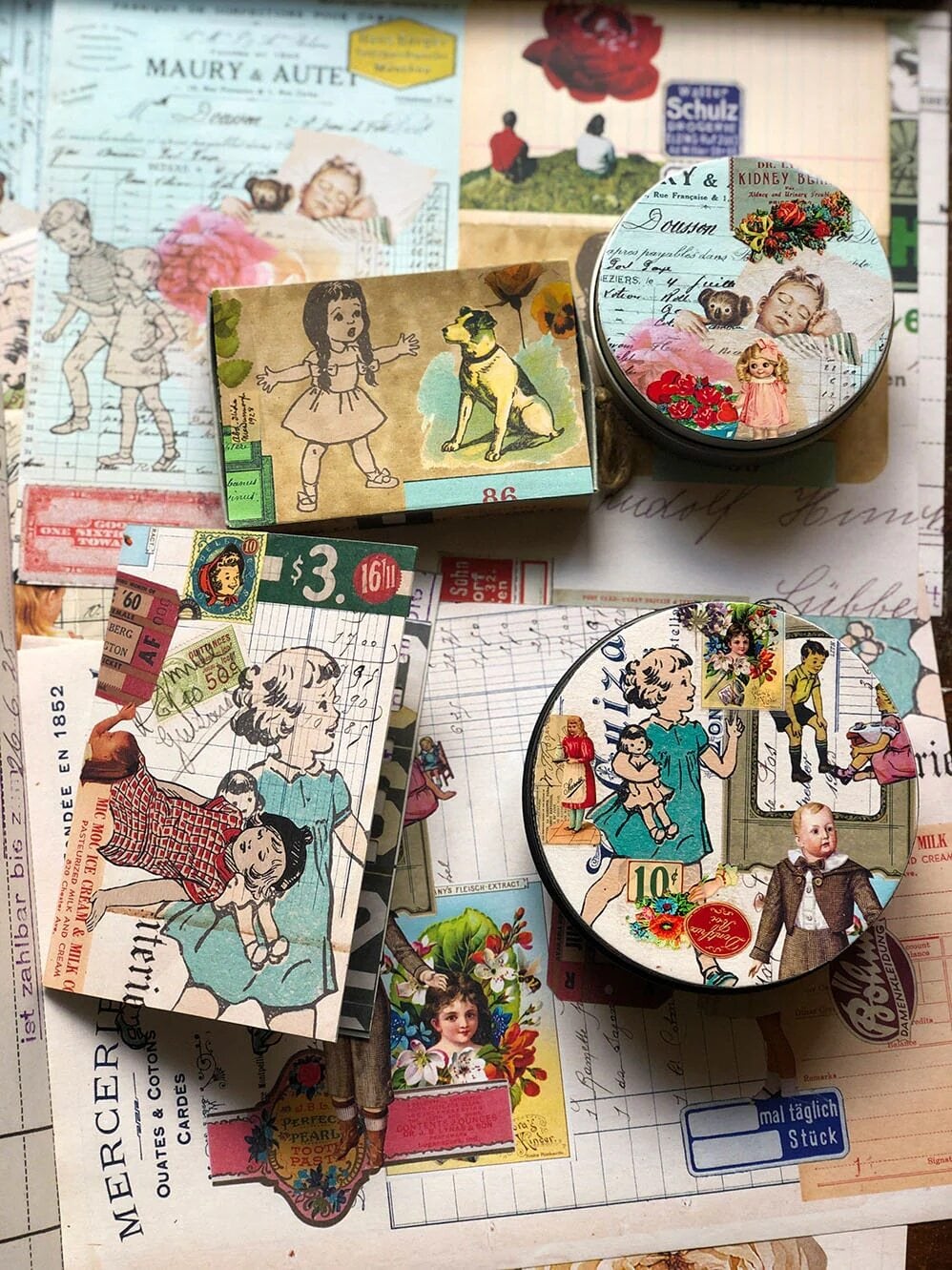 A5サイズほどのペーパーが4種類、各3枚ずつ入っています。フランスのヴィンテージ紙の上にコラージュされた、レトロな子供のイラストやヴィンテージのイメージがとっても素敵なデザインです。