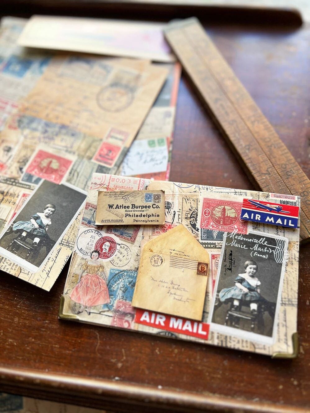 A5サイズほどのペーパーが4種類、各3枚ずつ入っています。郵便をテーマに、ヴィンテージの手紙やポストカード、写真などがコラージュされたとっても素敵なデザインです。