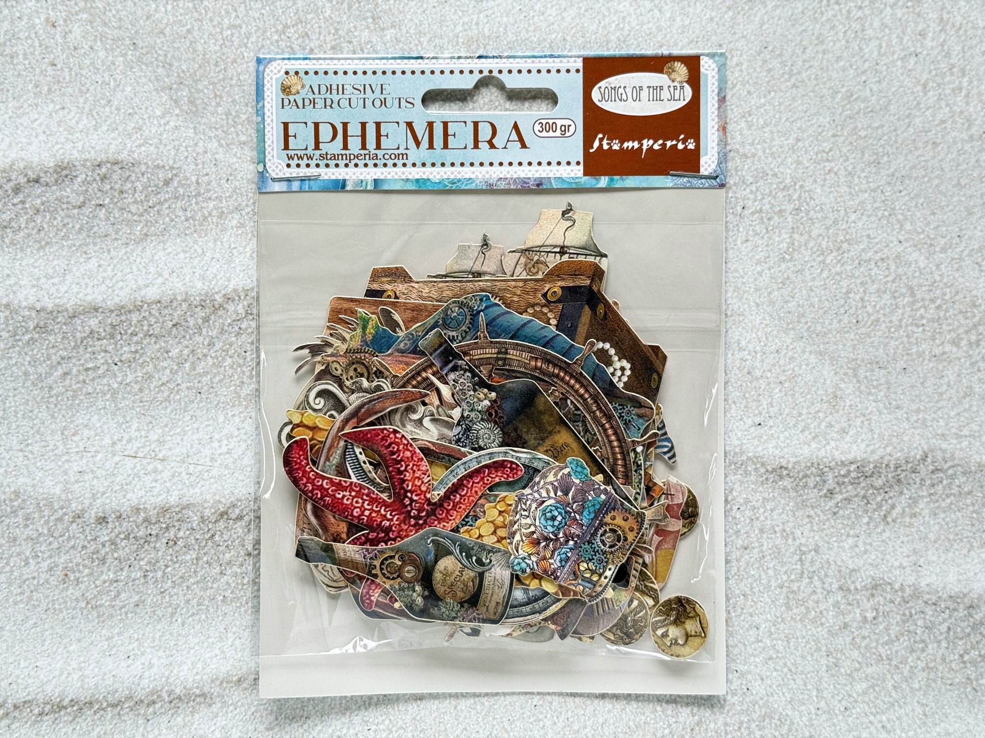 ほどよい厚みがあるダイカット素材で、シール状になっているので簡単に貼り付けることができます。写真では分かりにくいですが、表面にパール調の上品なきらめきがあります。「Songs of the Sea」シリーズは、スチームパンクのテイスト溢れる神秘的な海をモチーフにしたデザインです。コラージュ、ジャンクジャーナル、手帳デコ、その他様々なクラフト作品やラッピングなどに。