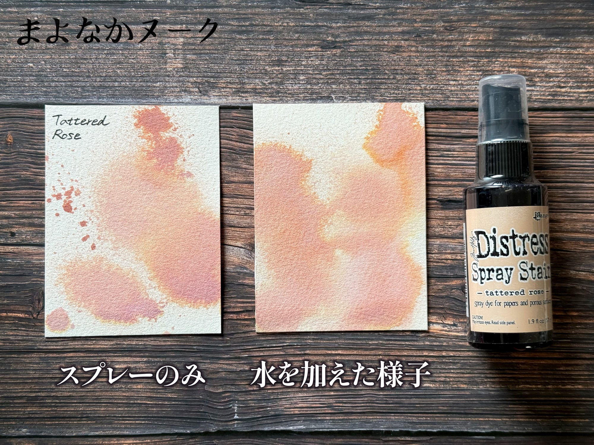 ディストレススプレーステインは、ディストレスインクと同じ染料のスプレーです。紙や木などの多孔質面に使用することができます。こちらの色は「Tattered Rose」です。