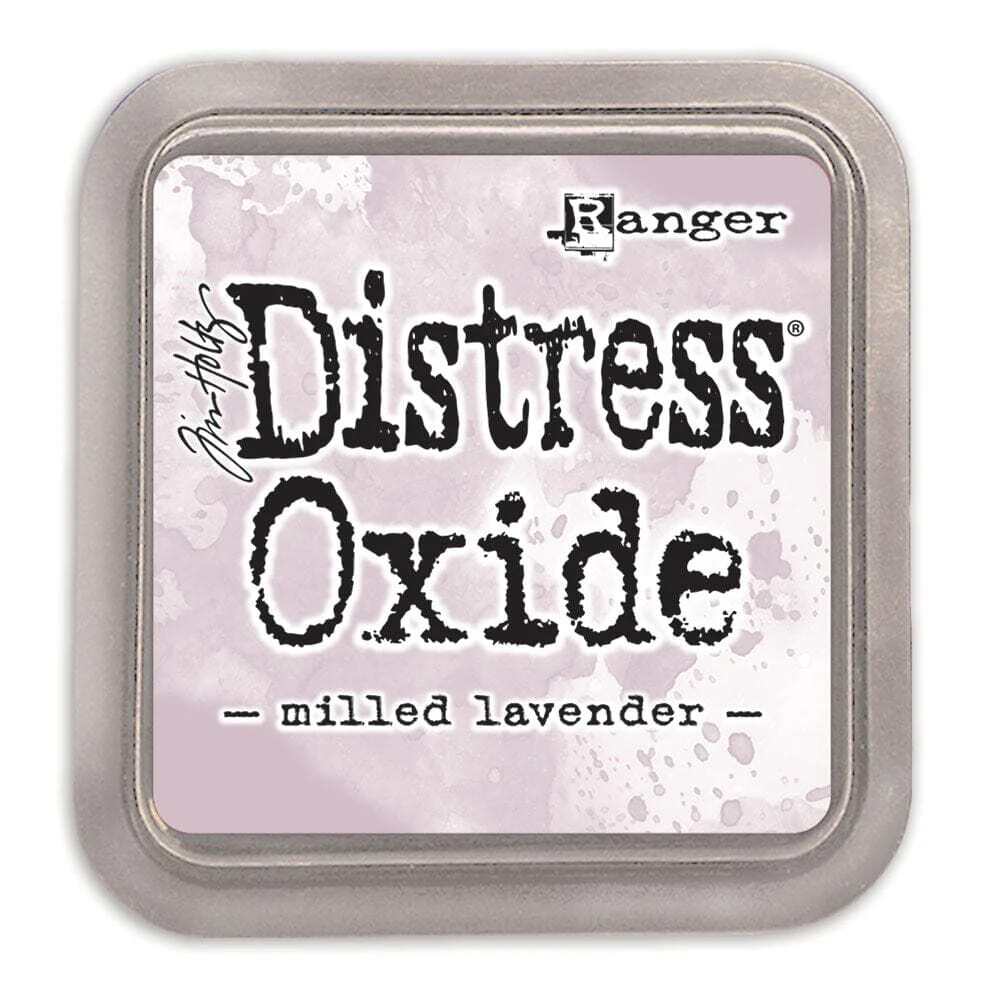 ディストレスオキサイドは、染料と顔料が混合された水性のインクです。スプレーなどで水を吹きかけると、独特の酸化したような効果を生み出します。ディストレスインクと比べると、ややクリーミーな色合いが特徴です。また、顔料が入っているため、濃い色の紙の上でもインクの色がしっかりと表れます。こちらの色は「Milled Lavender」です。