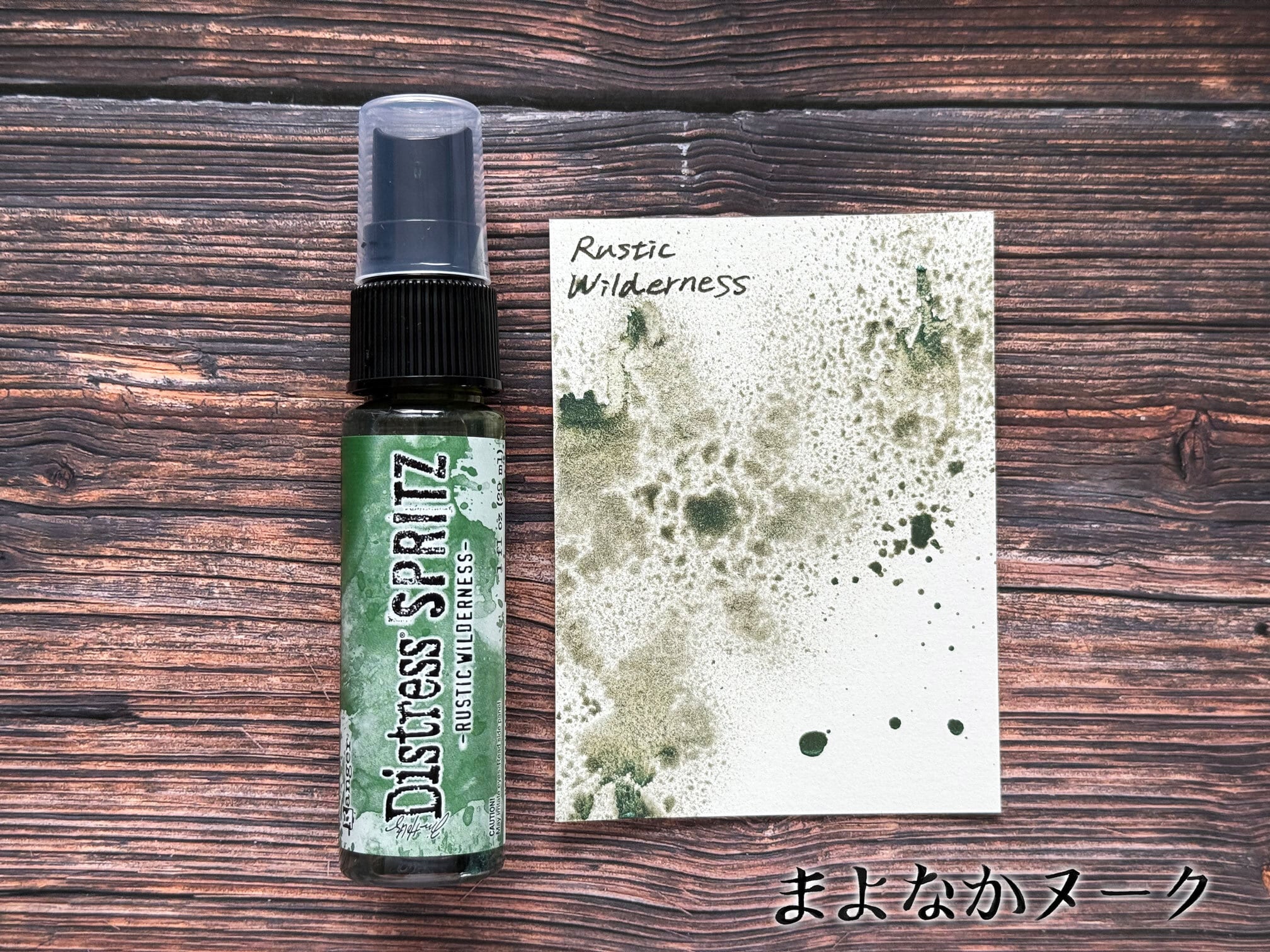 ディストレススプリッツは、透明な液体にパール顔料がブレンドされたスプレーです。紙や木などの多孔質面に使用することができます。こちらの色は「Rustic Wilderness」です。