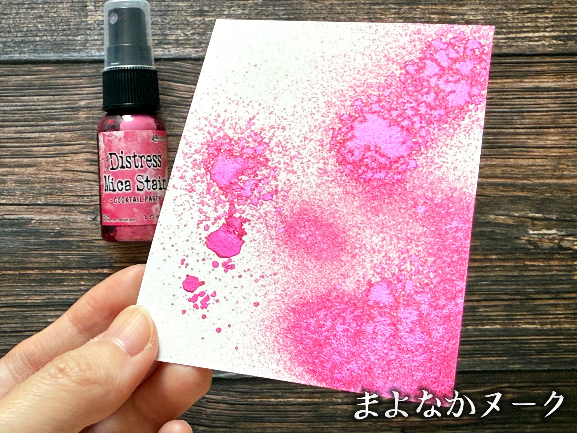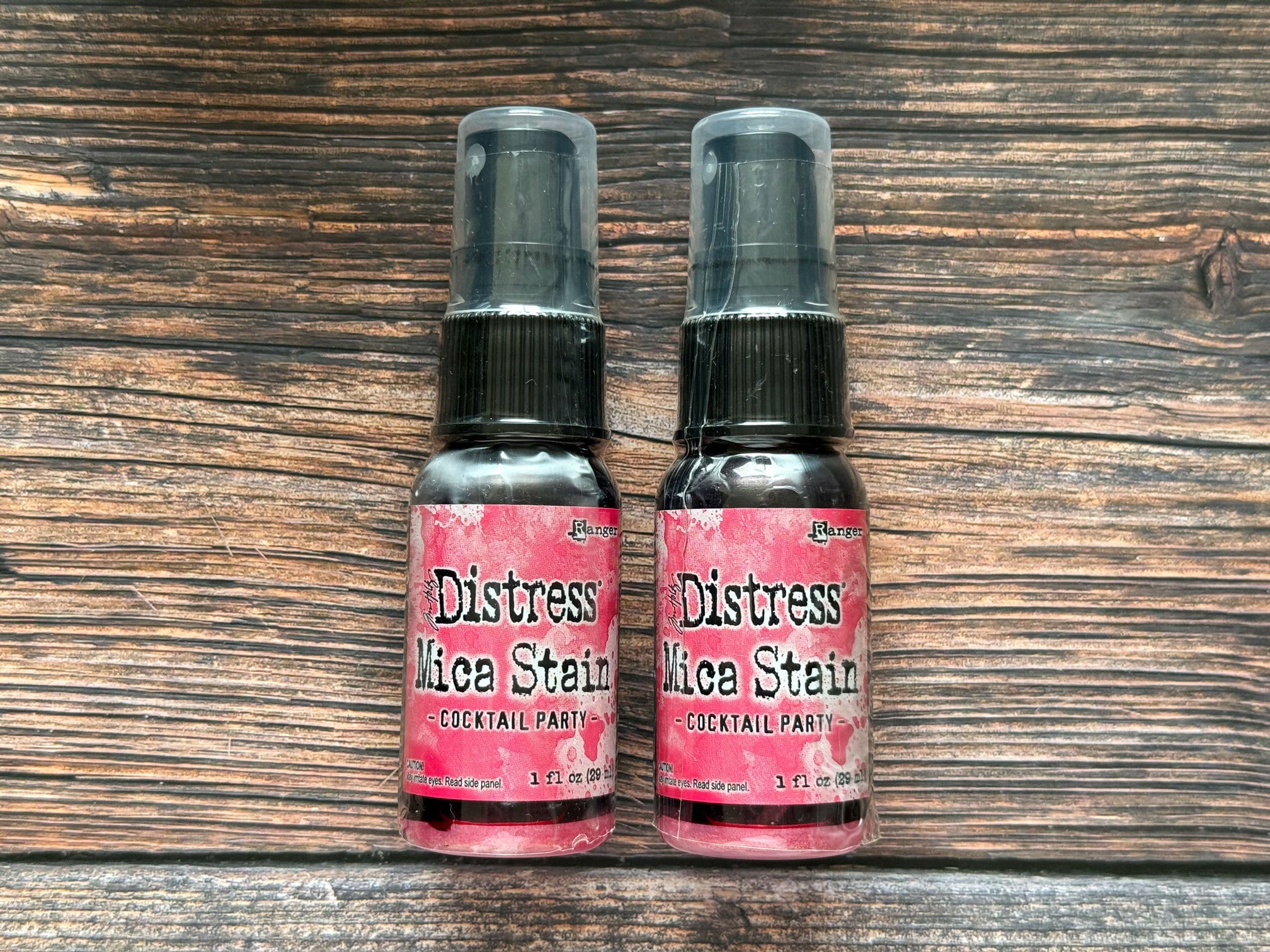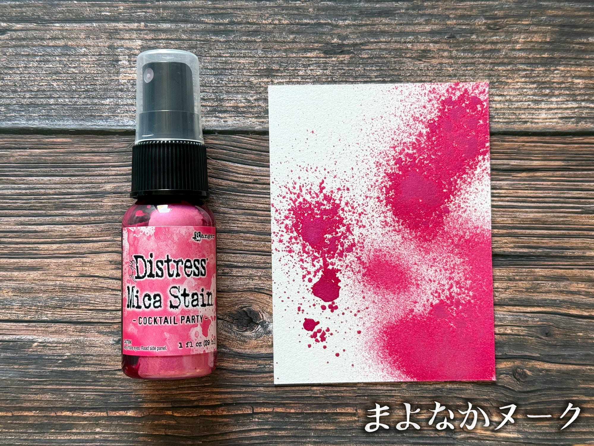 ディストレスマイカステインは、パール顔料がブレンドされたスプレーです。紙や木などの多孔質面に使用することができます。こちらの色は「Cocktail Party」です。
