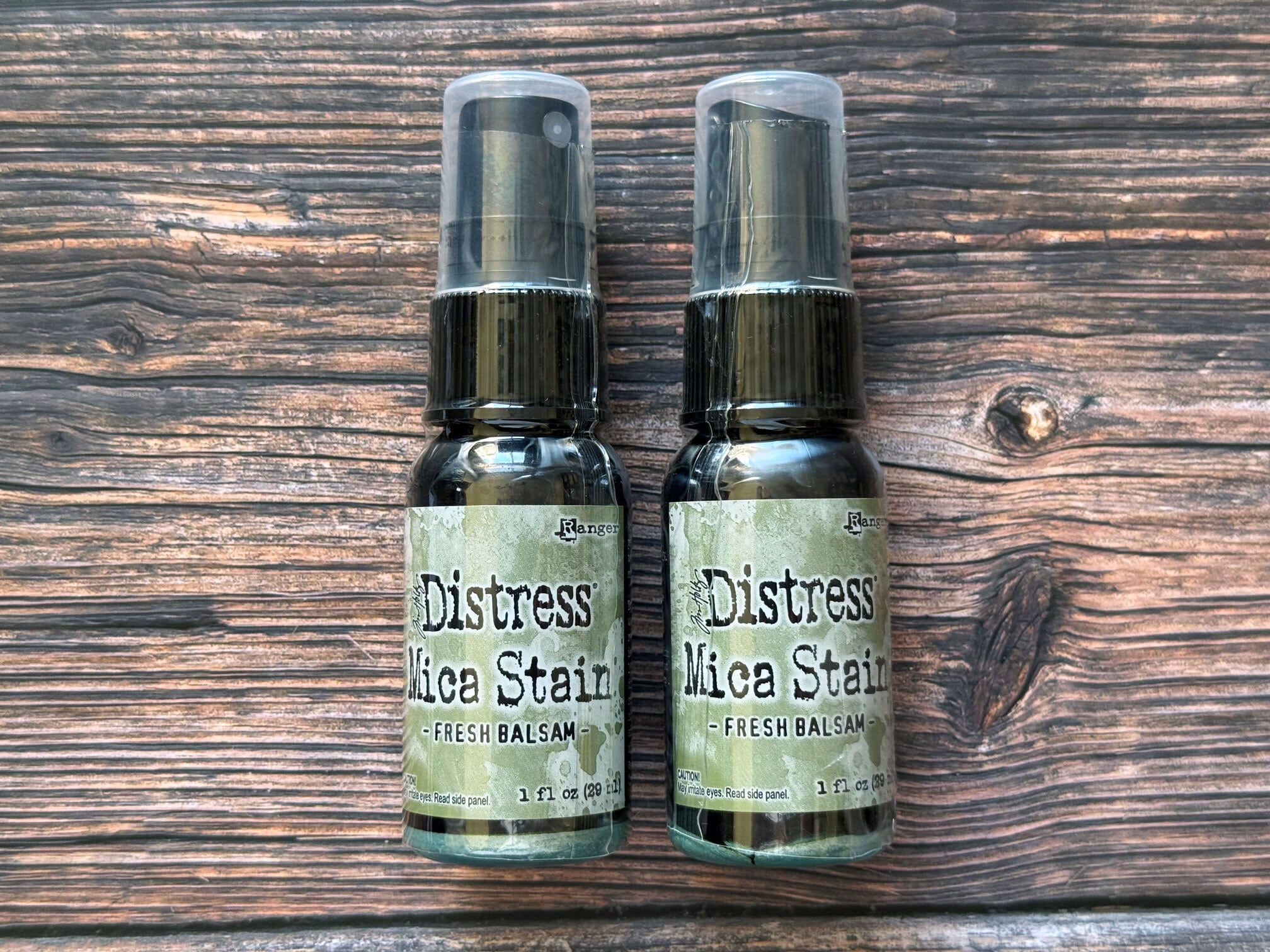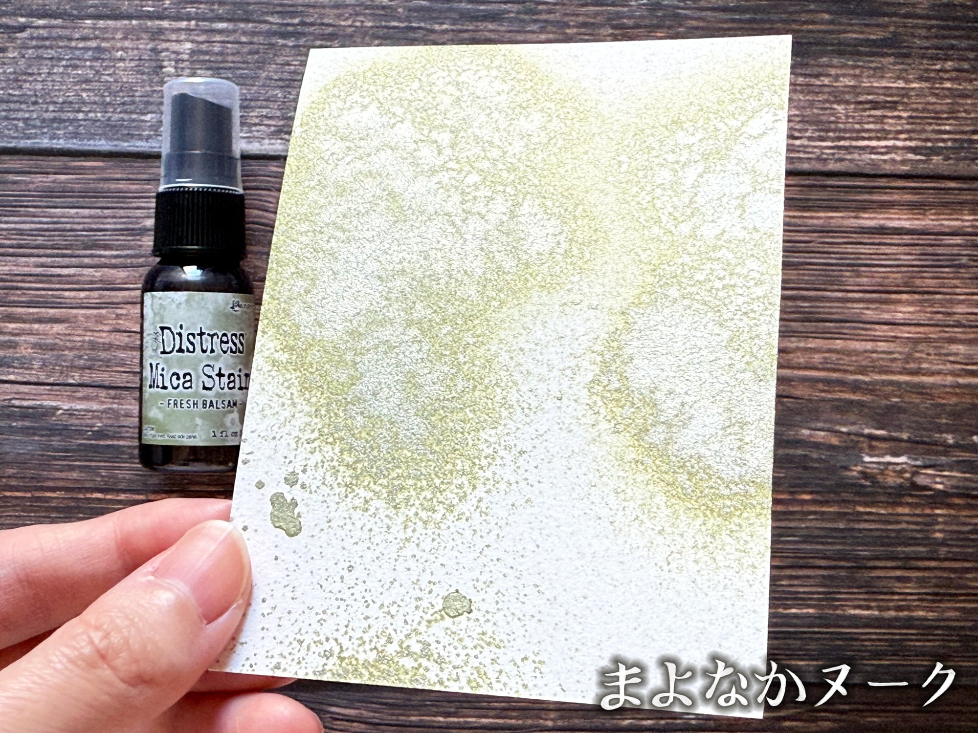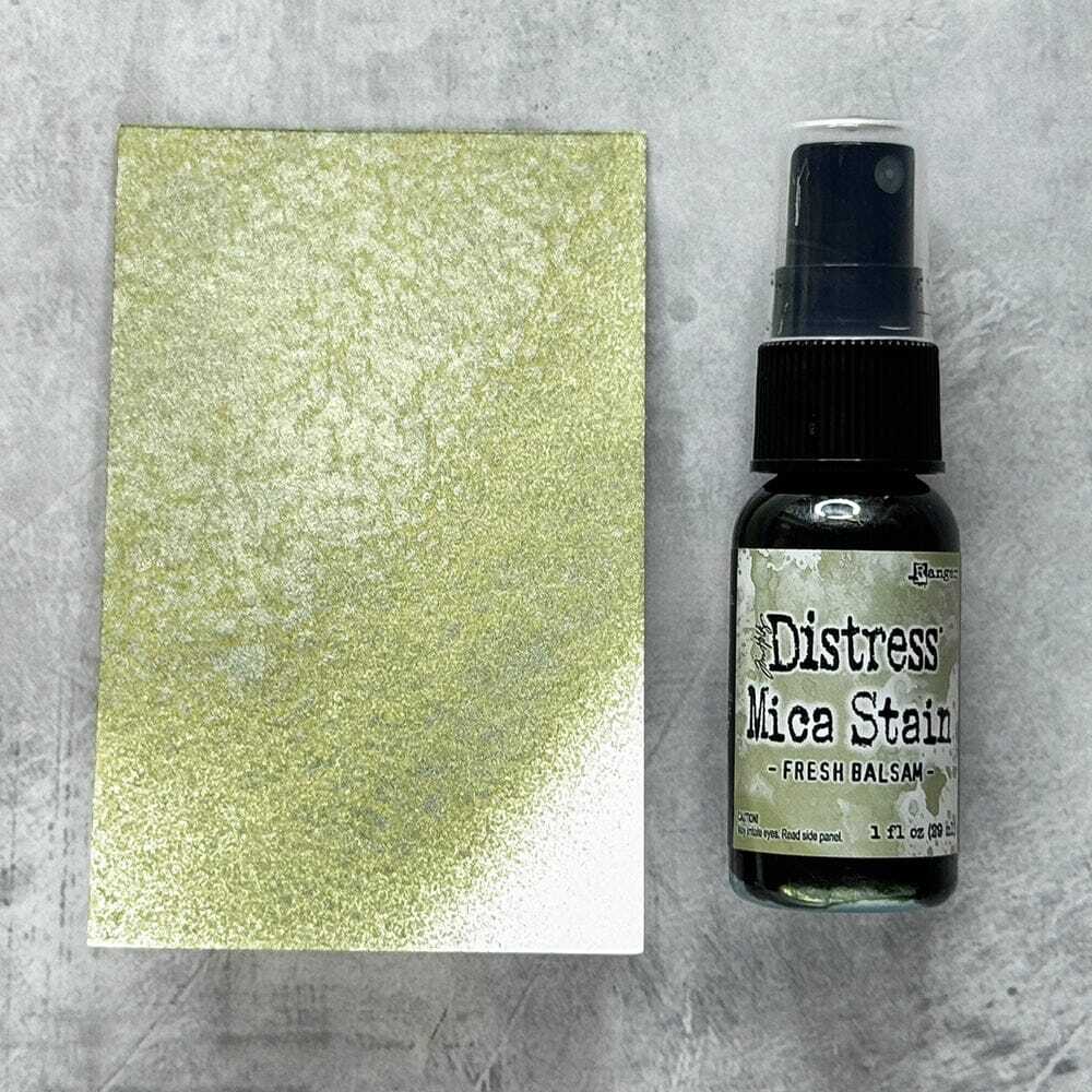 ディストレスマイカステインは、パール顔料がブレンドされたスプレーです。紙や木などの多孔質面に使用することができます。こちらの色は「Fresh Balsam」です。