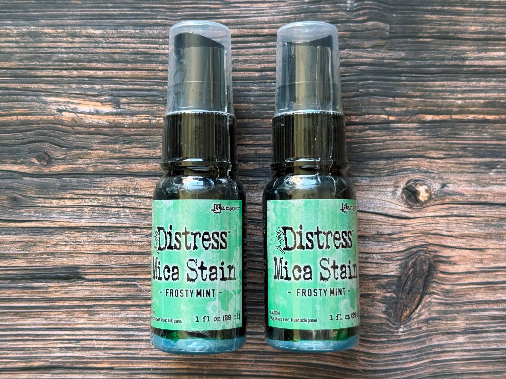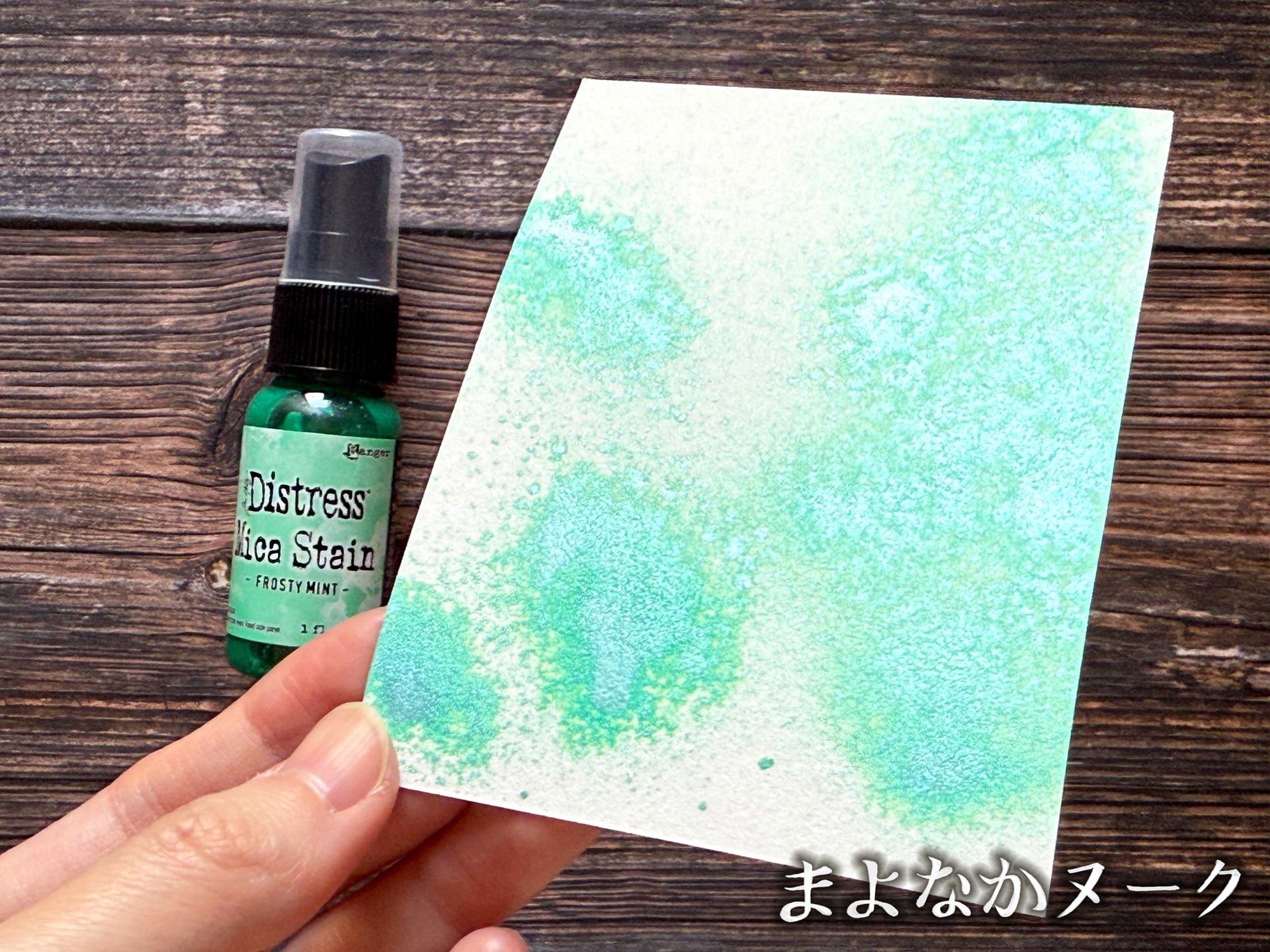 ディストレスマイカステインは、パール顔料がブレンドされたスプレーです。紙や木などの多孔質面に使用することができます。こちらの色は「Frosty Mint」です。