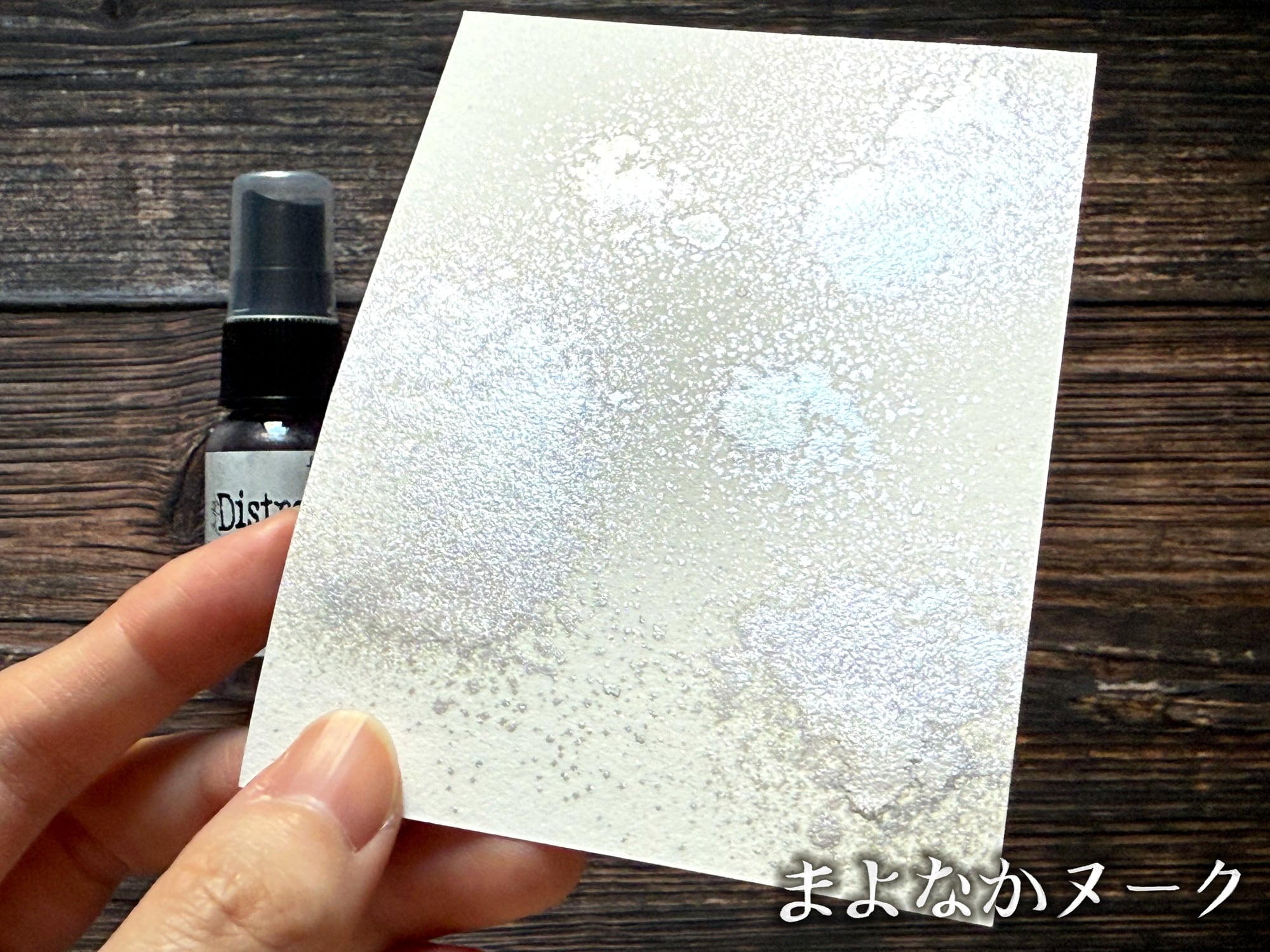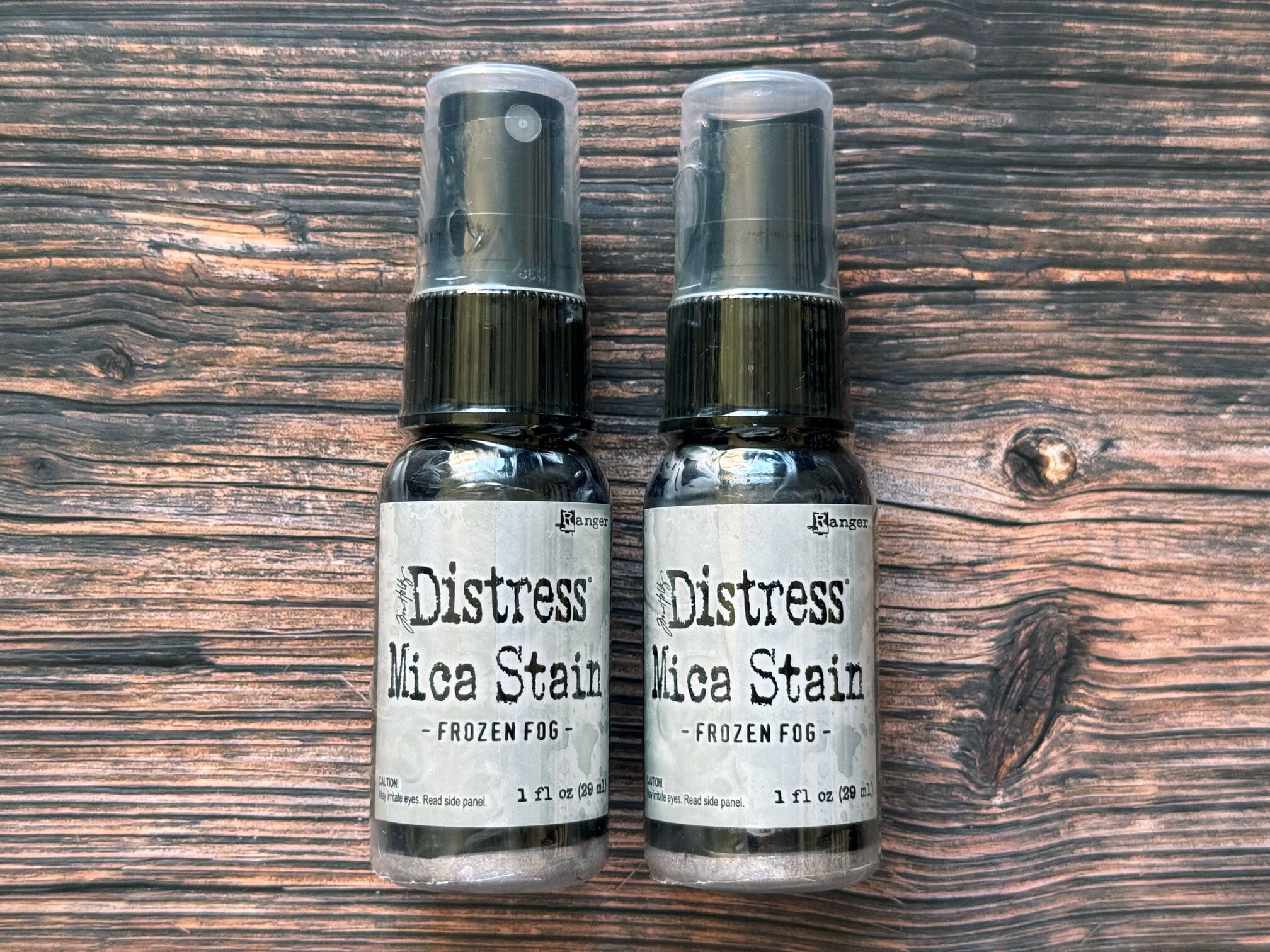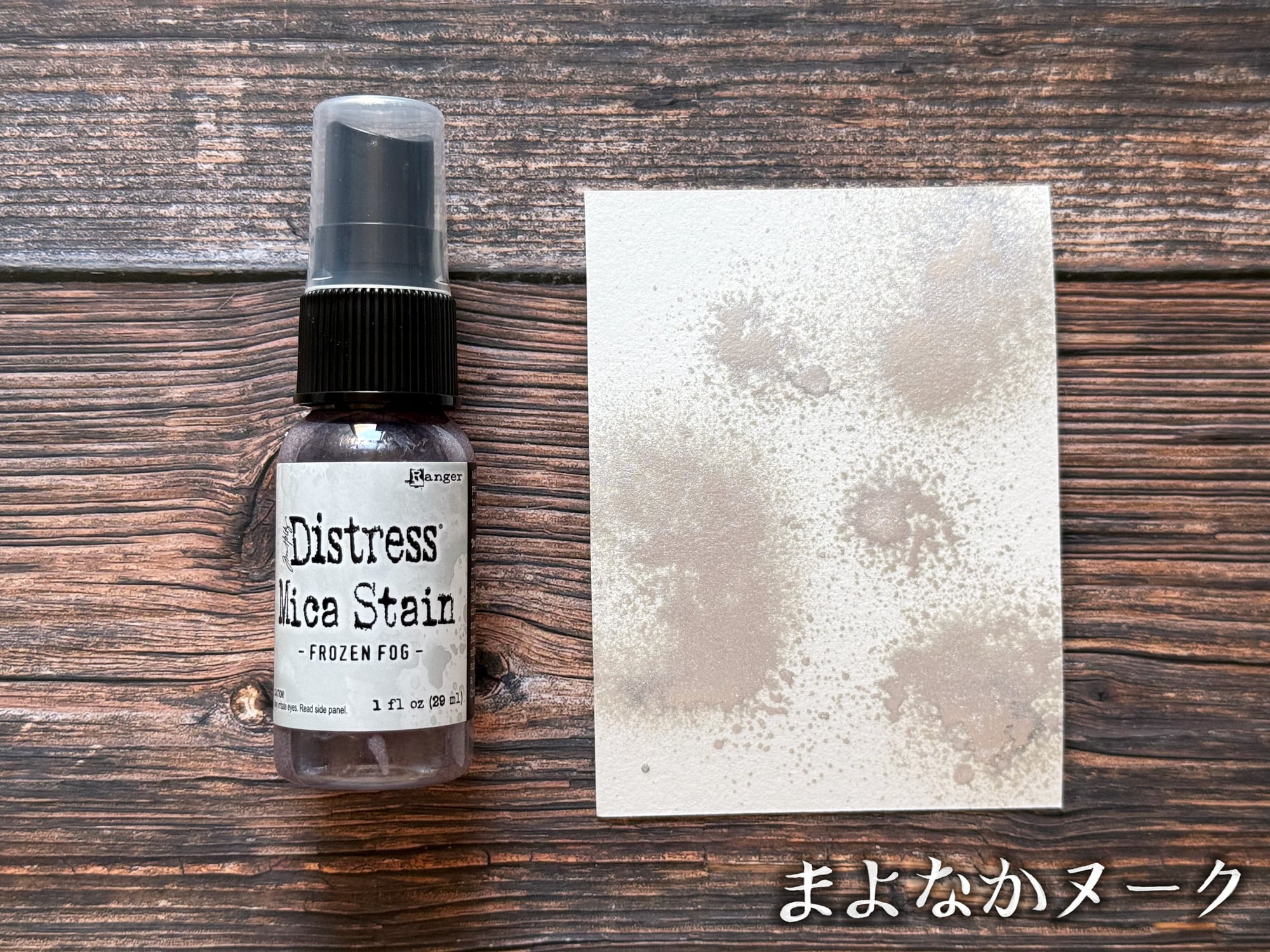 ディストレスマイカステインは、パール顔料がブレンドされたスプレーです。紙や木などの多孔質面に使用することができます。こちらの色は「Frozen Fog」です。