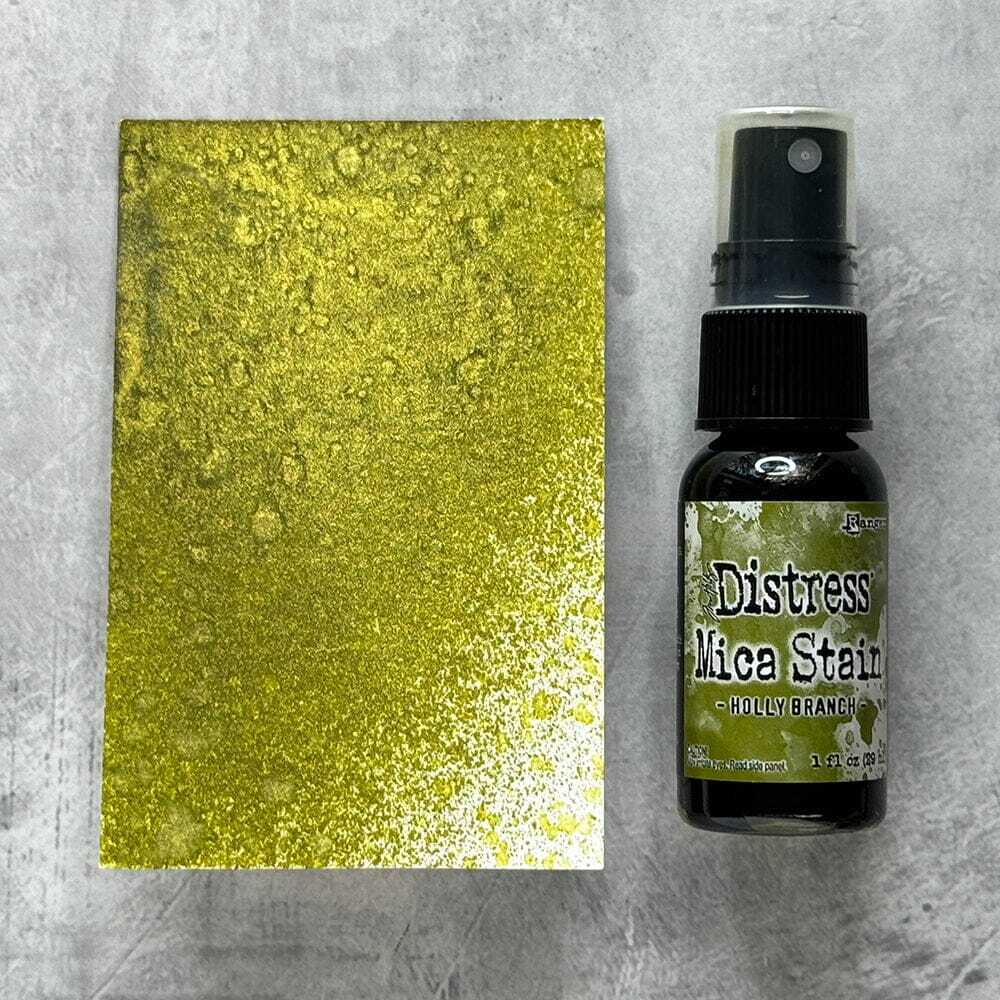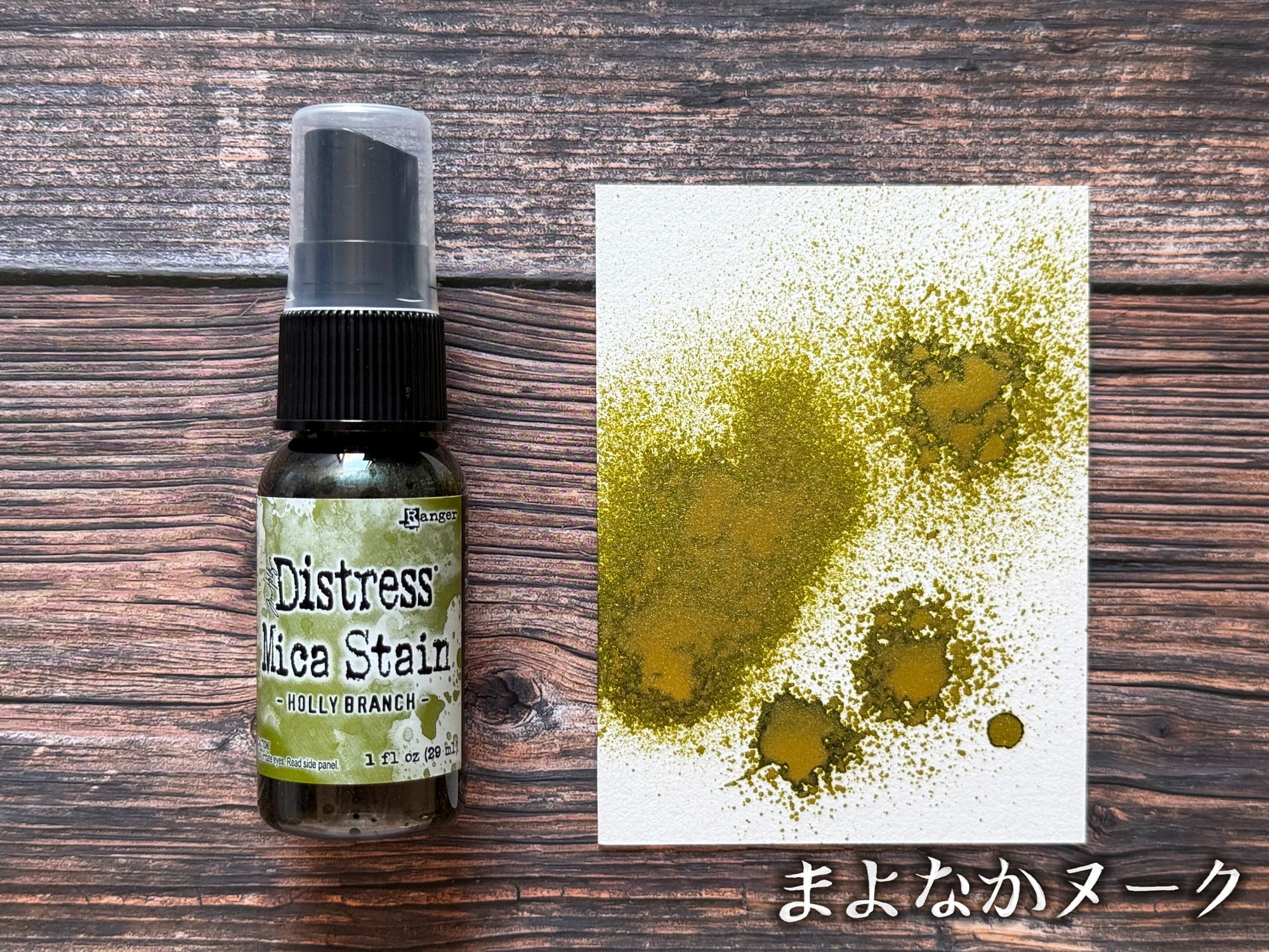 ディストレスマイカステインは、パール顔料がブレンドされたスプレーです。紙や木などの多孔質面に使用することができます。こちらの色は「Holy Branch」です。