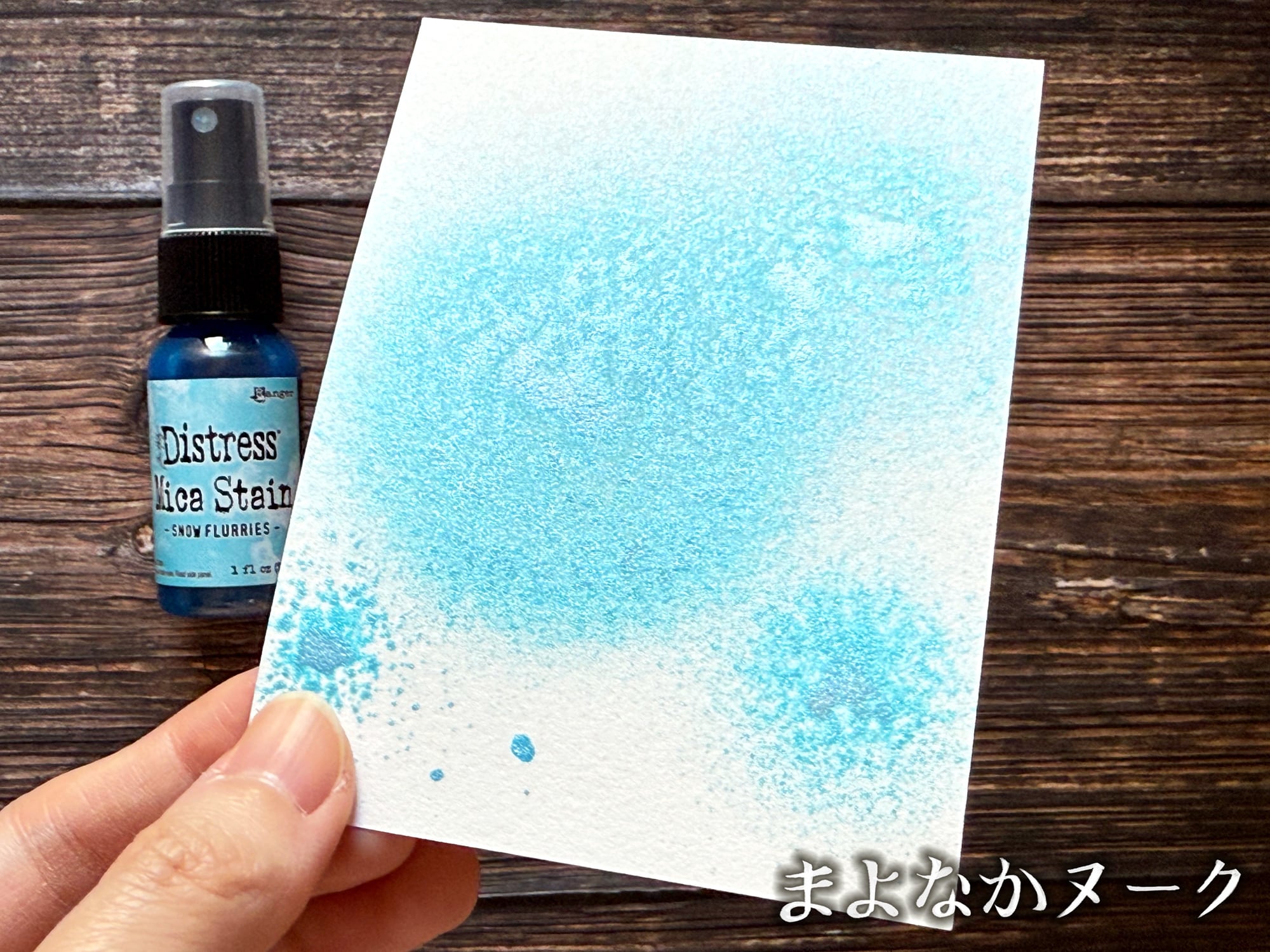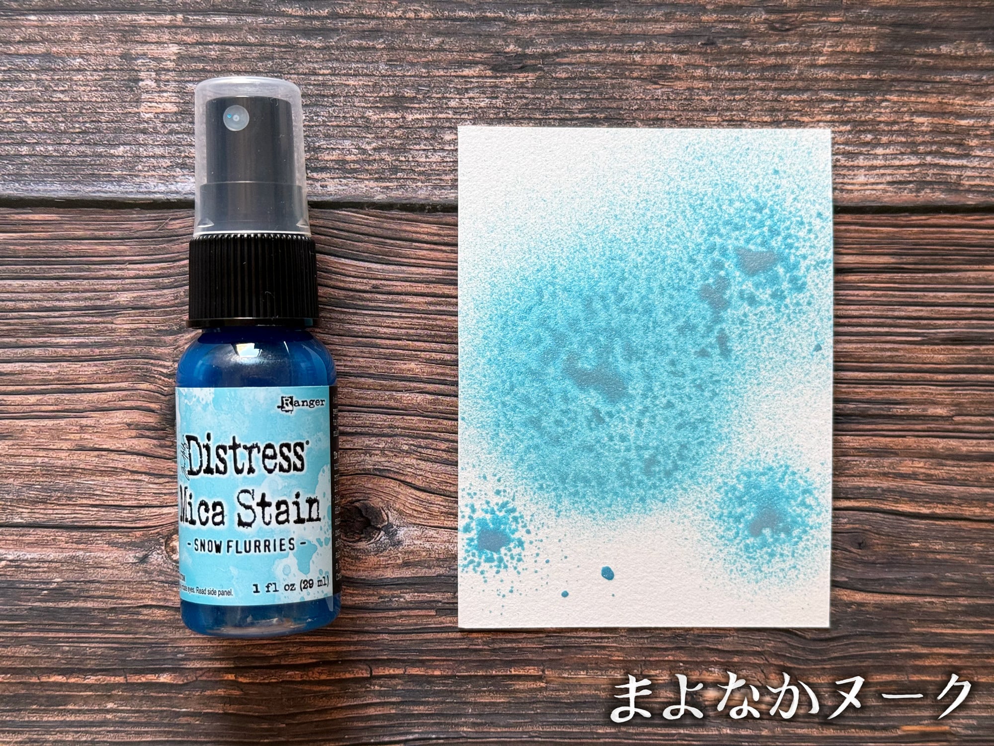 ディストレスマイカステインは、パール顔料がブレンドされたスプレーです。紙や木などの多孔質面に使用することができます。こちらの色は「Snow Flurries」です。