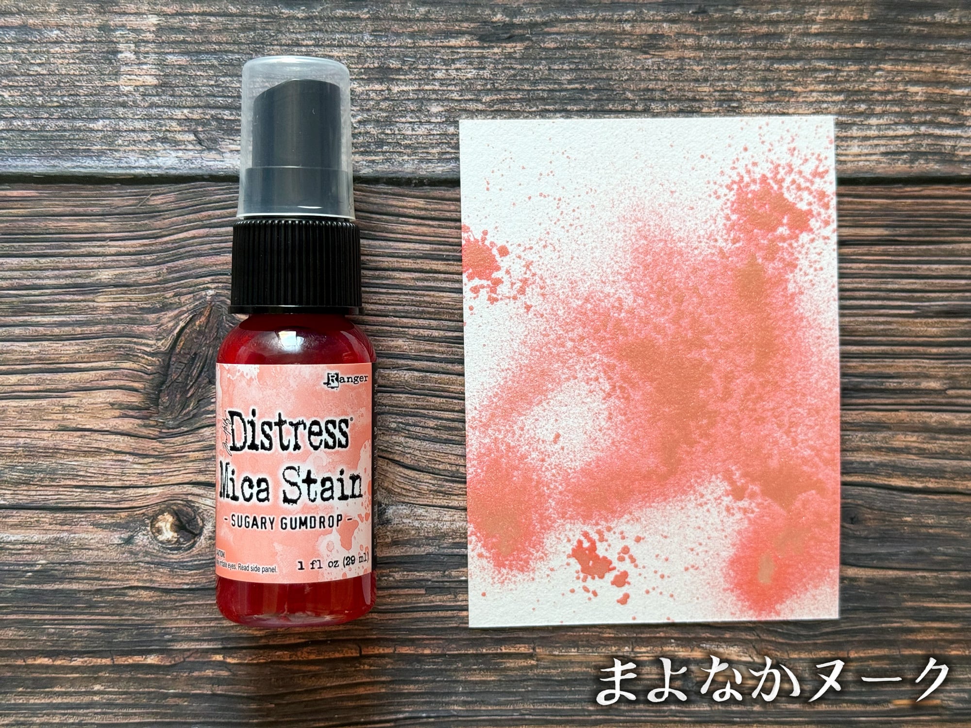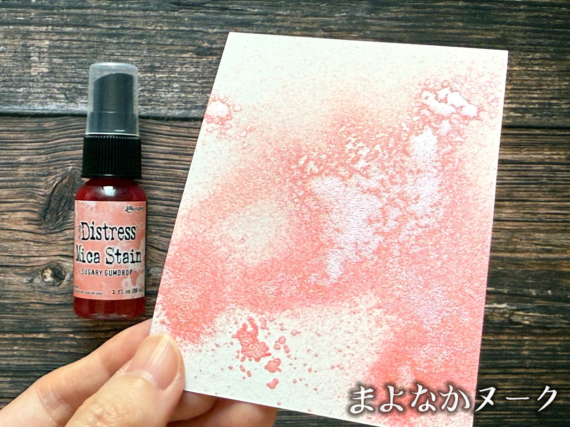 ディストレスマイカステインは、パール顔料がブレンドされたスプレーです。紙や木などの多孔質面に使用することができます。こちらの色は「Sugary Gumdrop」です。