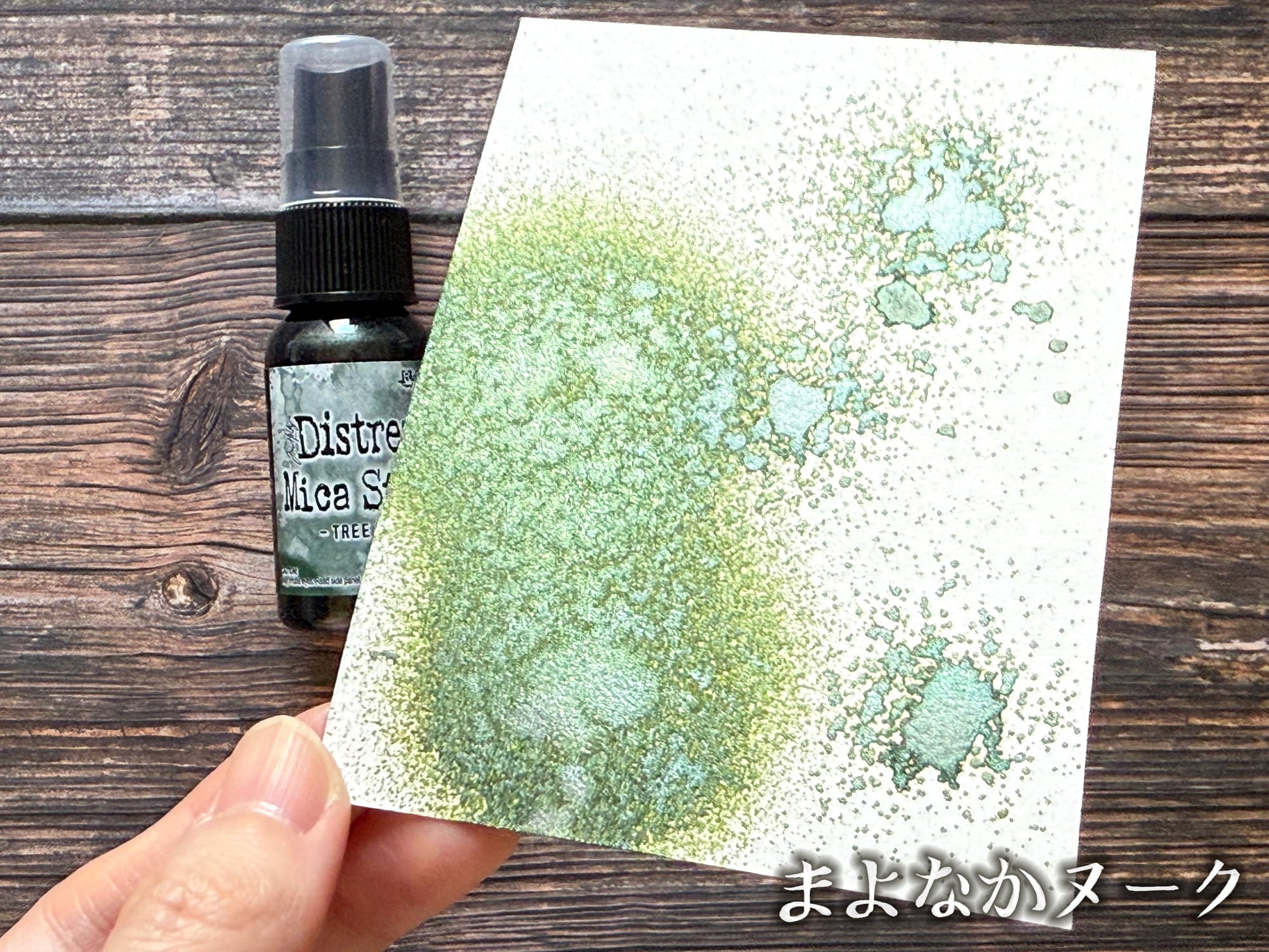 ディストレスマイカステインは、パール顔料がブレンドされたスプレーです。紙や木などの多孔質面に使用することができます。こちらの色は「Tree Lot」です。