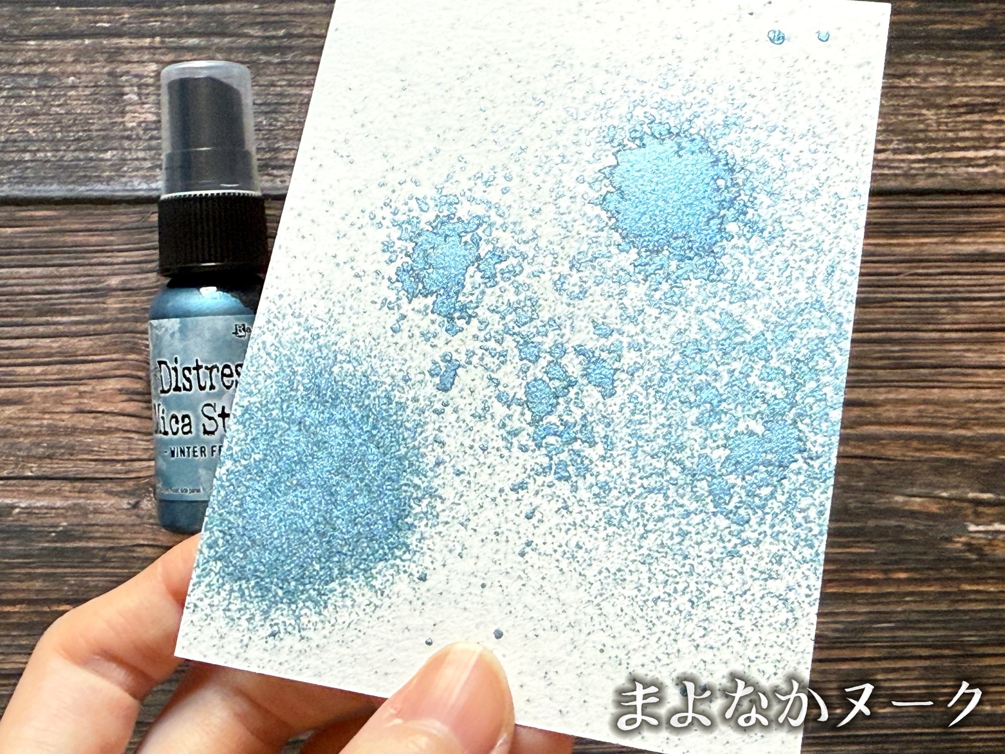 ディストレスマイカステインは、パール顔料がブレンドされたスプレーです。紙や木などの多孔質面に使用することができます。こちらの色は「Winter Frost」です。