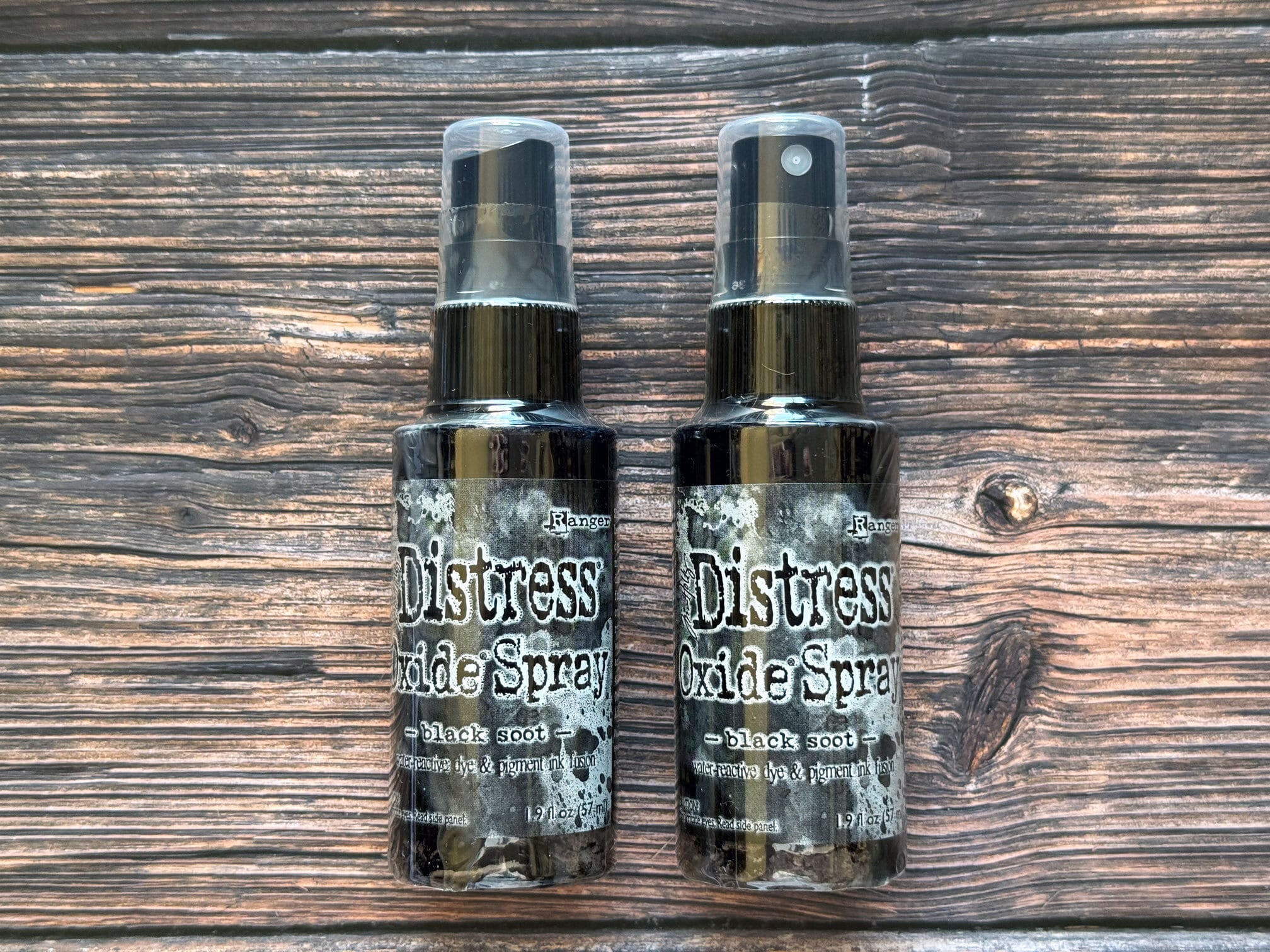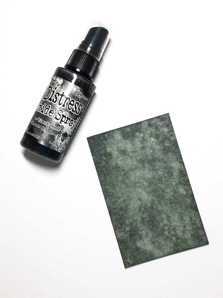 ディストレスオキサイドスプレーは、ディストレスオキサイドと同じ染料と顔料が混合された水性スプレーです。紙や木などの多孔質面に使用することができます。こちらの色は「Black Soot」です。
