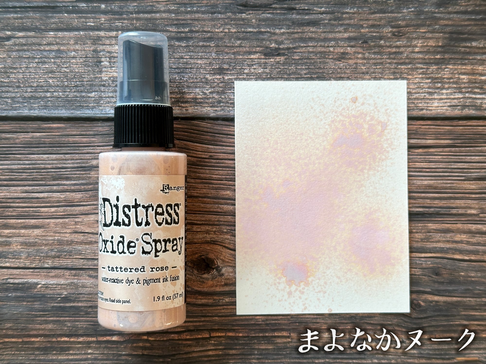 ディストレスオキサイドスプレーは、ディストレスオキサイドと同じ染料と顔料が混合された水性スプレーです。紙や木などの多孔質面に使用することができます。こちらの色は「Tattered Rose」です。
