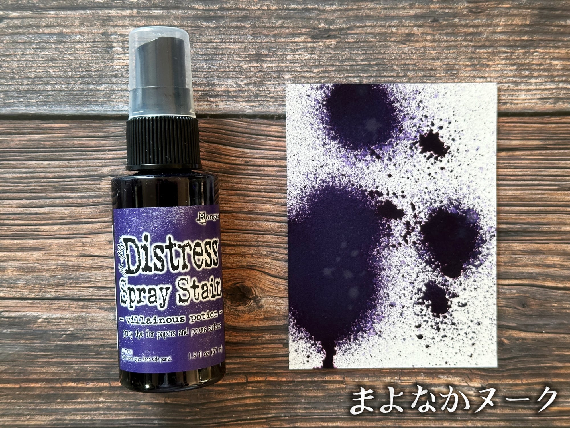 ディストレススプレーステインは、ディストレスインクと同じ染料のスプレーです。紙や木などの多孔質面に使用することができます。こちらの色は「Villainous Potion」です。