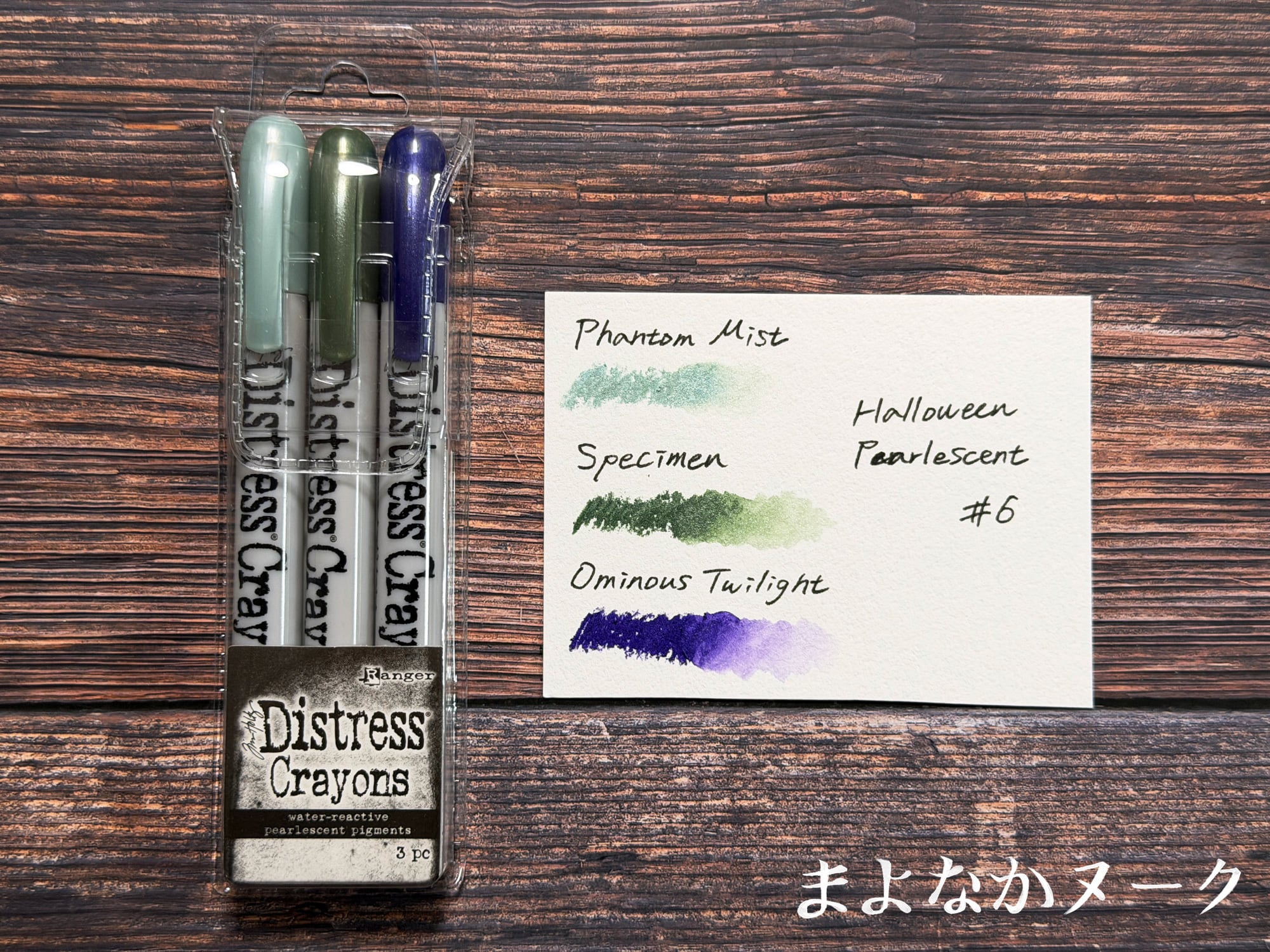 こちらはハロウィンシーズンに合わせて作られた、繊細なパール入りのディストレスクレヨンです。ハロウィンを彷彿とさせる特別な色合いと、きらめく輝きが楽しめます。