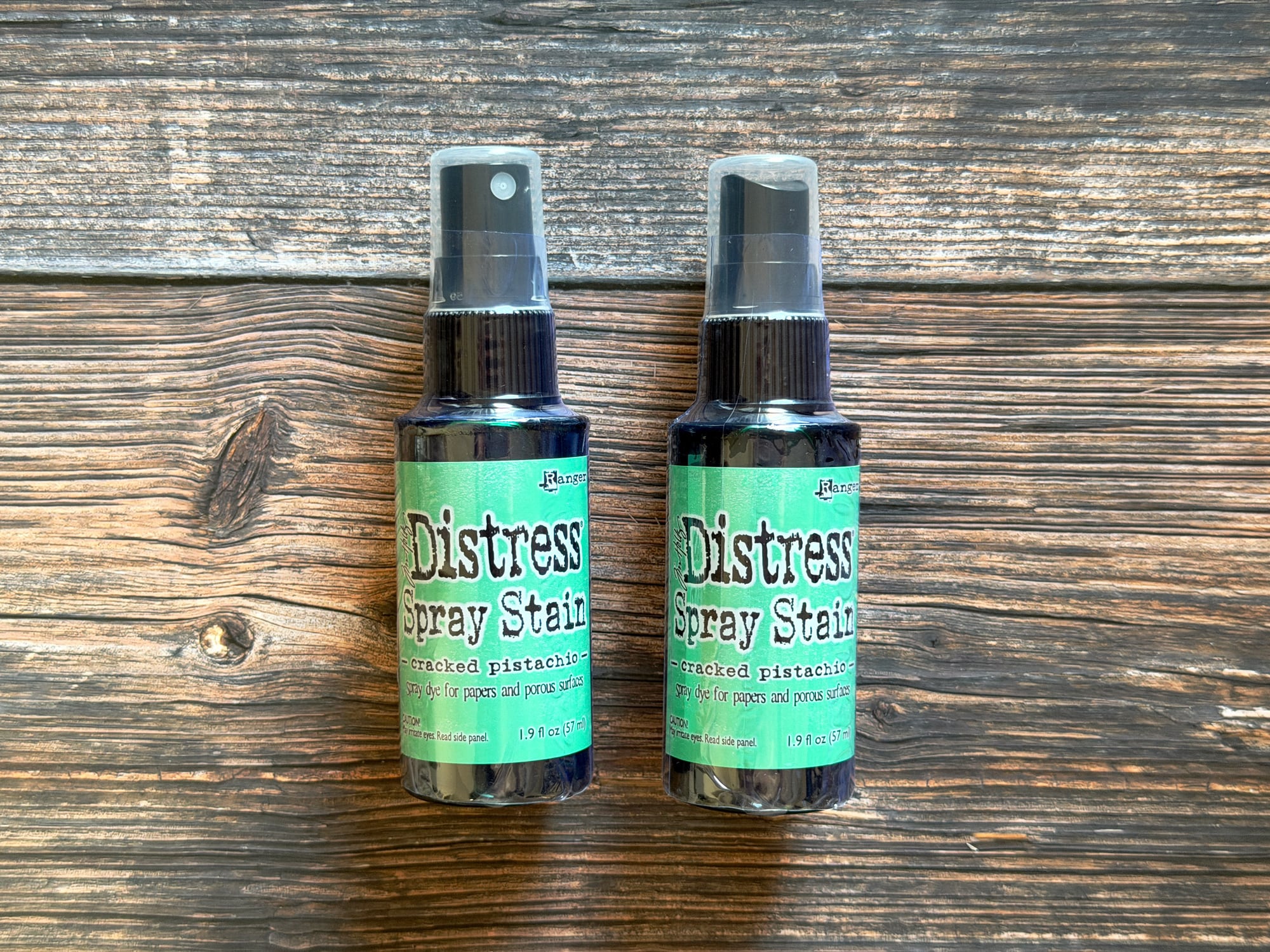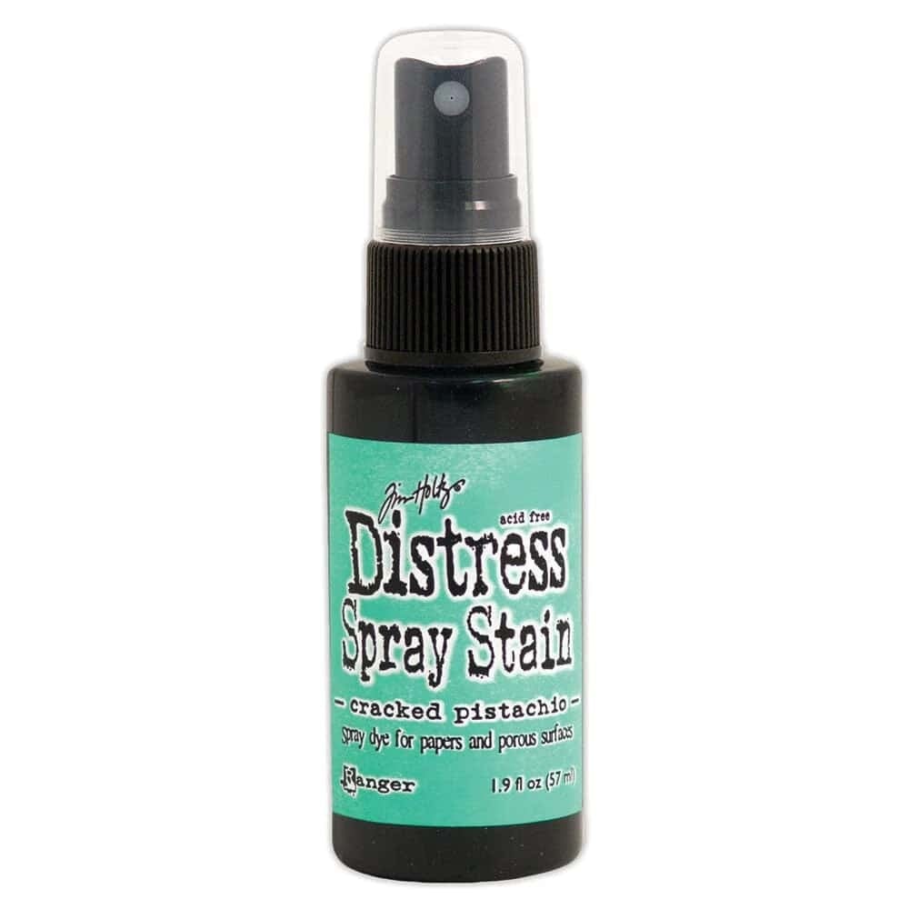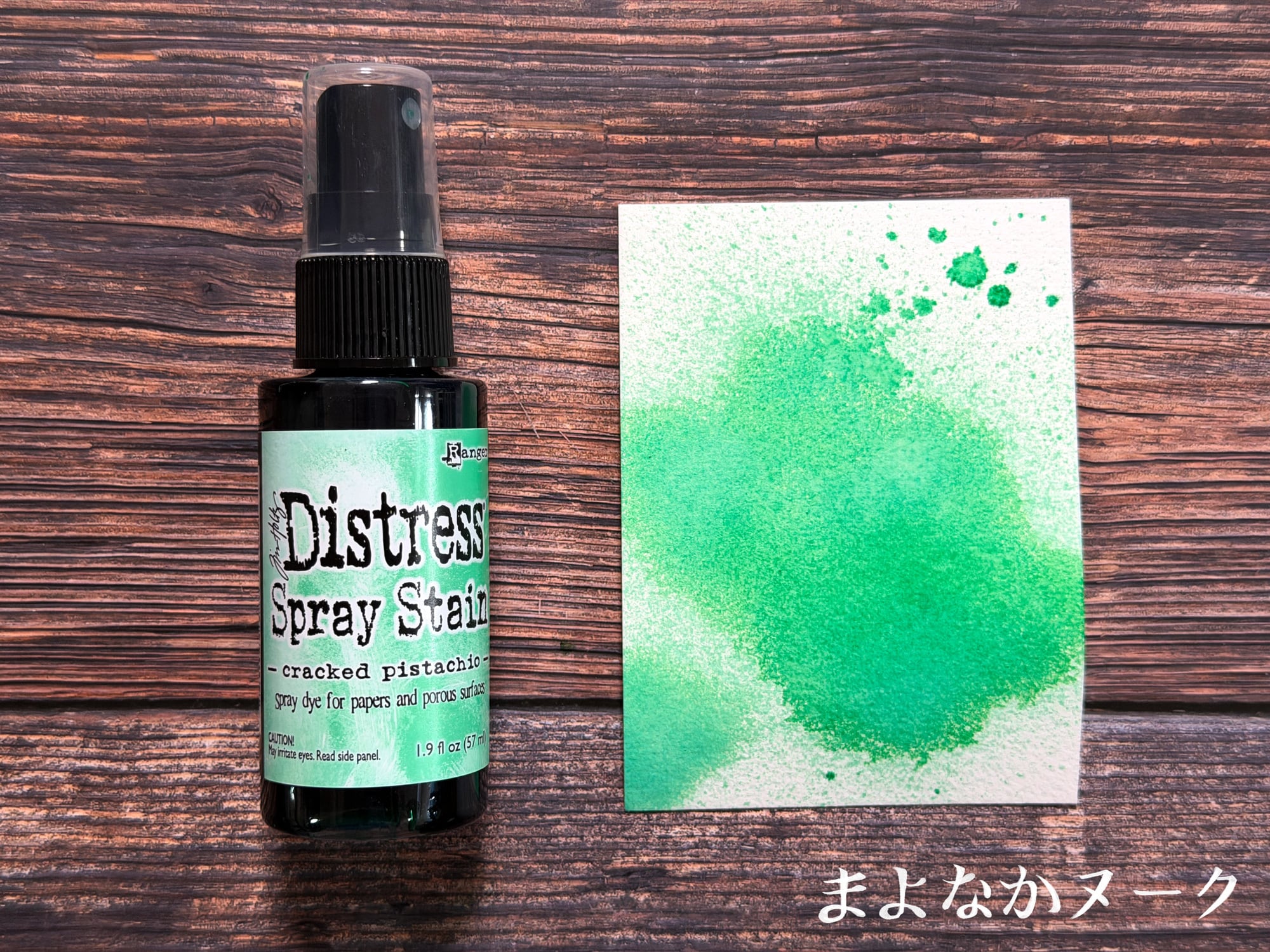 ディストレススプレーステインは、ディストレスインクと同じ染料のスプレーです。紙や木などの多孔質面に使用することができます。こちらの色は「Crackled Pistachio」です。