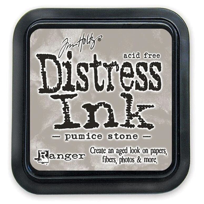 ディストレスインクは、紙などの表面にヴィンテージ効果を作り出すために調合された色褪せしにくい水性染料インクです。水彩絵の具のように水に反応するため、水をスプレーしたり水筆で伸ばすことで独特の効果を生み出すこともできます。こちらの色は「Pumice Stone」です。