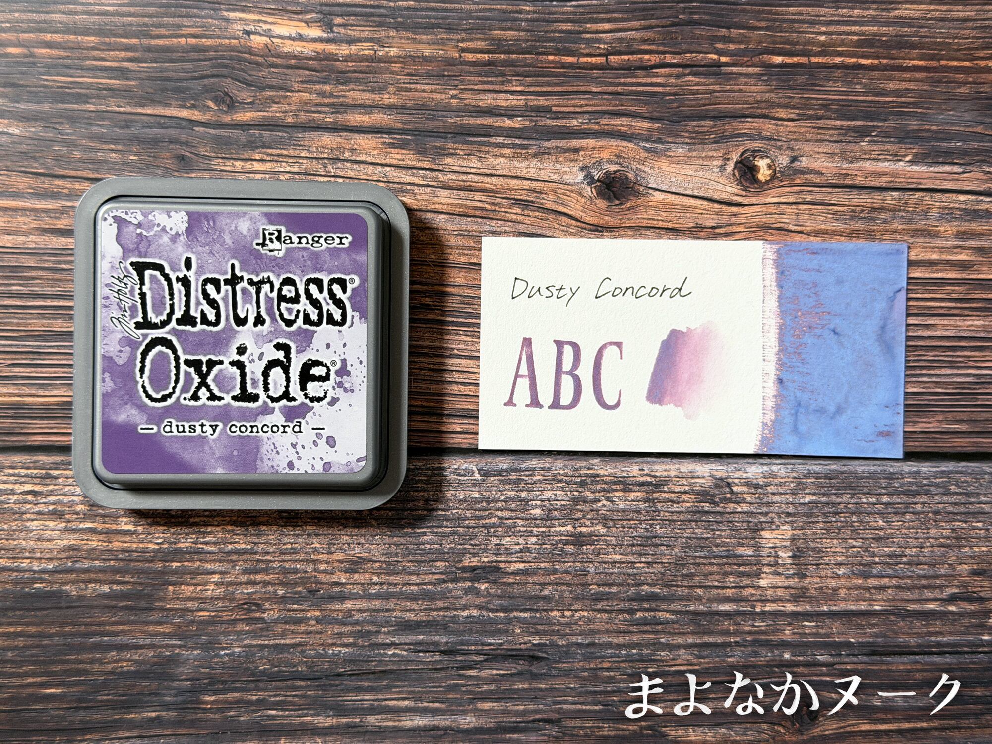ディストレスオキサイドは、染料と顔料が混合された水性のインクです。スプレーなどで水を吹きかけると、独特の酸化したような効果を生み出します。ディストレスインクと比べると、ややクリーミーな色合いが特徴です。また、顔料が入っているため、濃い色の紙の上でもインクの色がしっかりと表れます。こちらの色は「Dusty Concord」です。