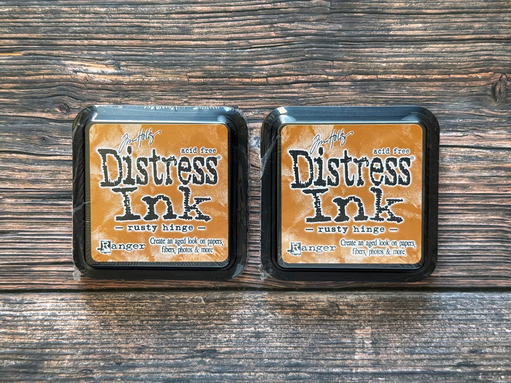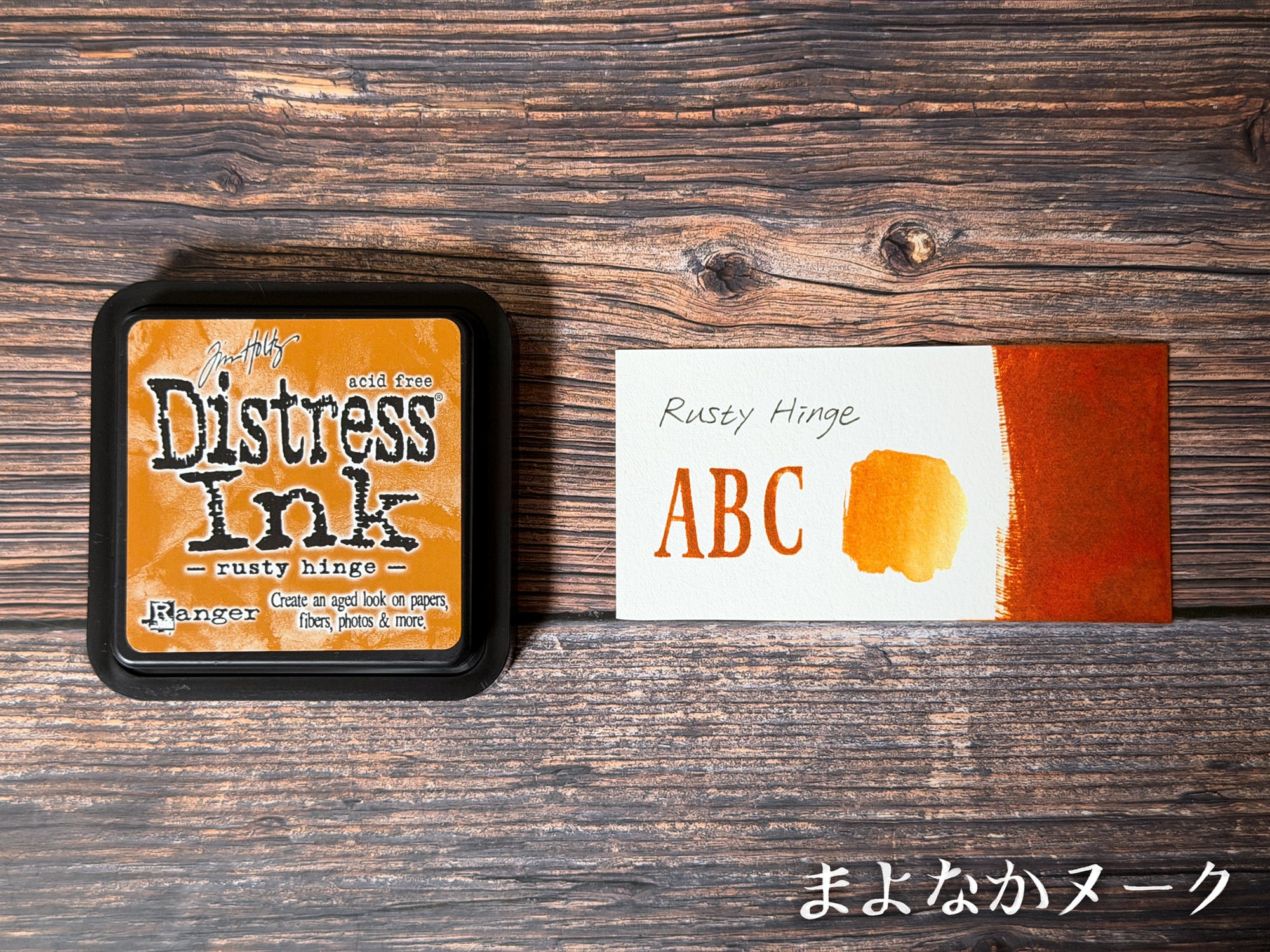 ディストレスインクは、紙などの表面にヴィンテージ効果を作り出すために調合された色褪せしにくい水性染料インクです。水彩絵の具のように水に反応するため、水をスプレーしたり水筆で伸ばすことで独特の効果を生み出すこともできます。こちらの色は「Rusty Hinge」です。