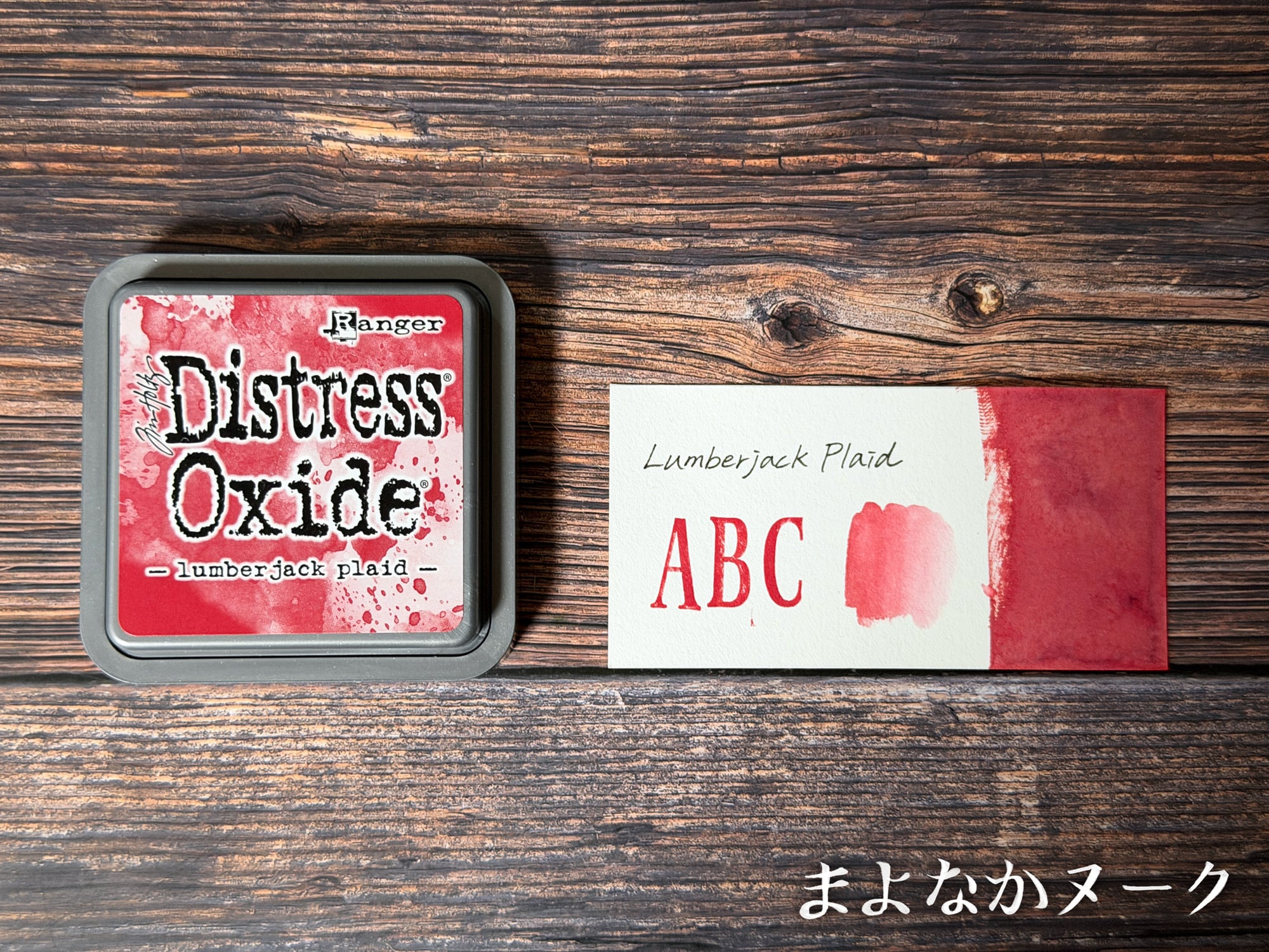 ディストレスオキサイドは、染料と顔料が混合された水性のインクです。スプレーなどで水を吹きかけると、独特の酸化したような効果を生み出します。ディストレスインクと比べると、ややクリーミーな色合いが特徴です。また、顔料が入っているため、濃い色の紙の上でもインクの色がしっかりと表れます。こちらの色は「Lumberjack Plaid」です。