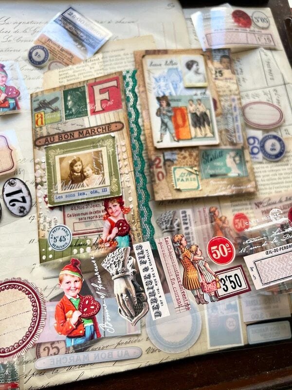 フランスのヴィンテージラベルや切手、子供のイラストなど、レトロな雰囲気たっぷりのデザインです。