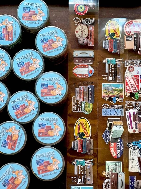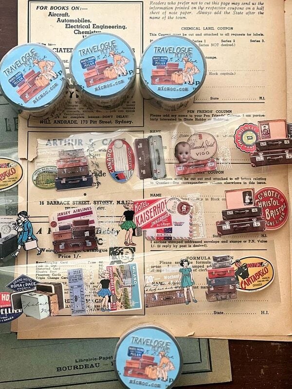 旅行をモチーフに、ヴィンテージの旅行かばんやラベル、チケットなどがデザインされています。思わず旅に出たくなってしまうような楽しいデザイン。