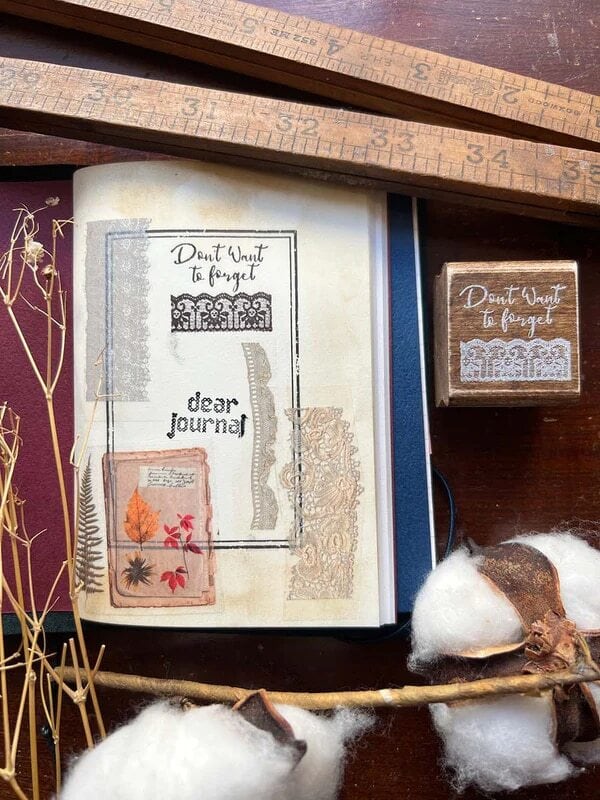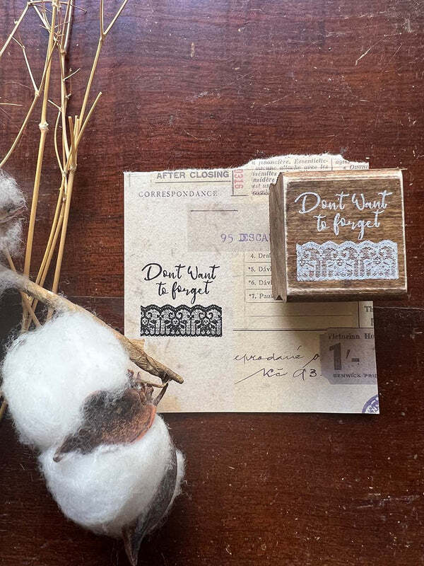 こちらは木の持ち手が付いているスタンプなので、そのままインクに付けて押せるようになっています。シンプルなフレーズとレースのデザインは、コラージュやジャンクジャーナルのアクセントのほか、普段のジャーナリングにもぴったりです。