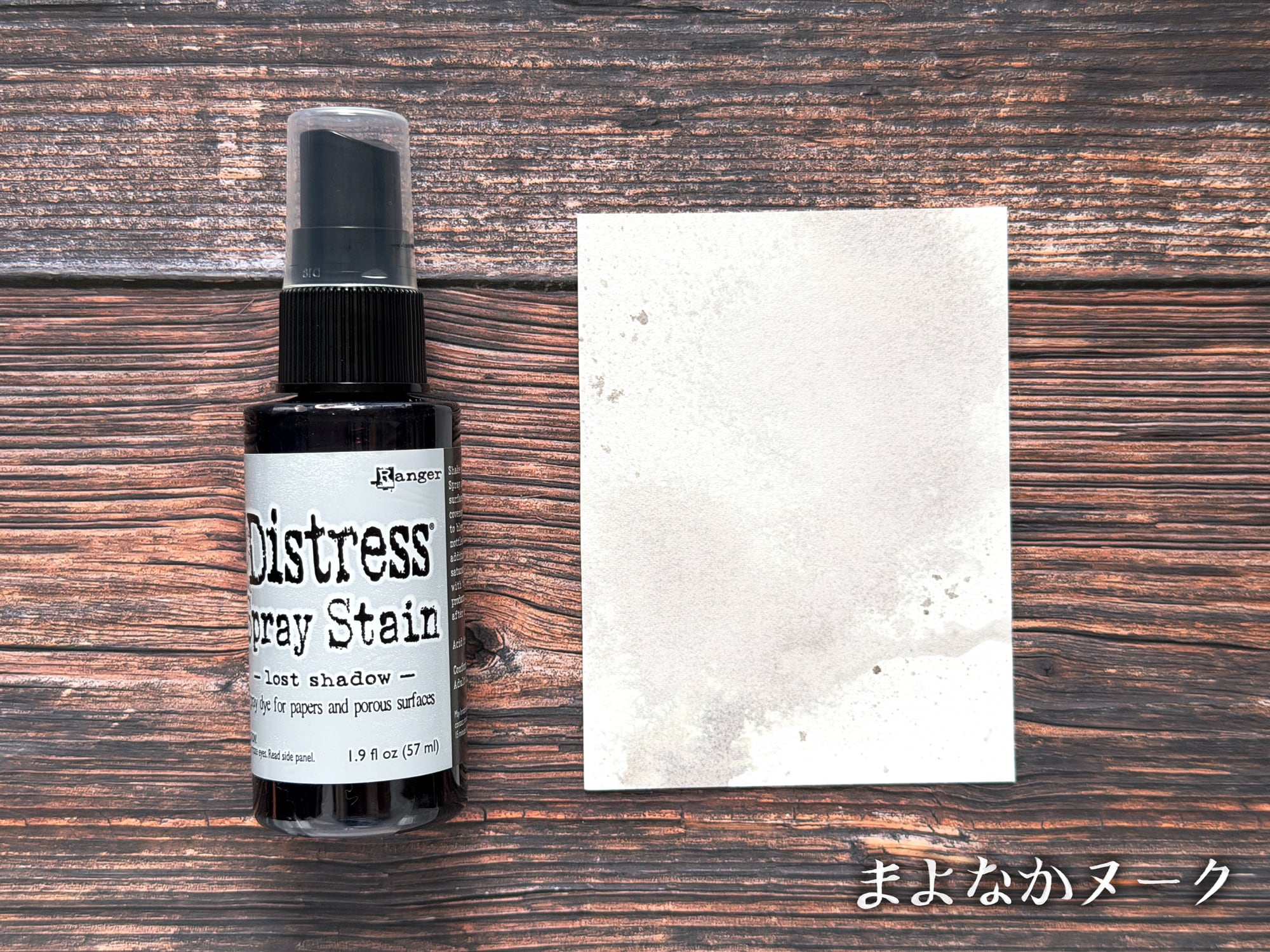 ディストレススプレーステインは、ディストレスインクと同じ染料のスプレーです。紙や木などの多孔質面に使用することができます。こちらの色は「Lost Shadow」です。
