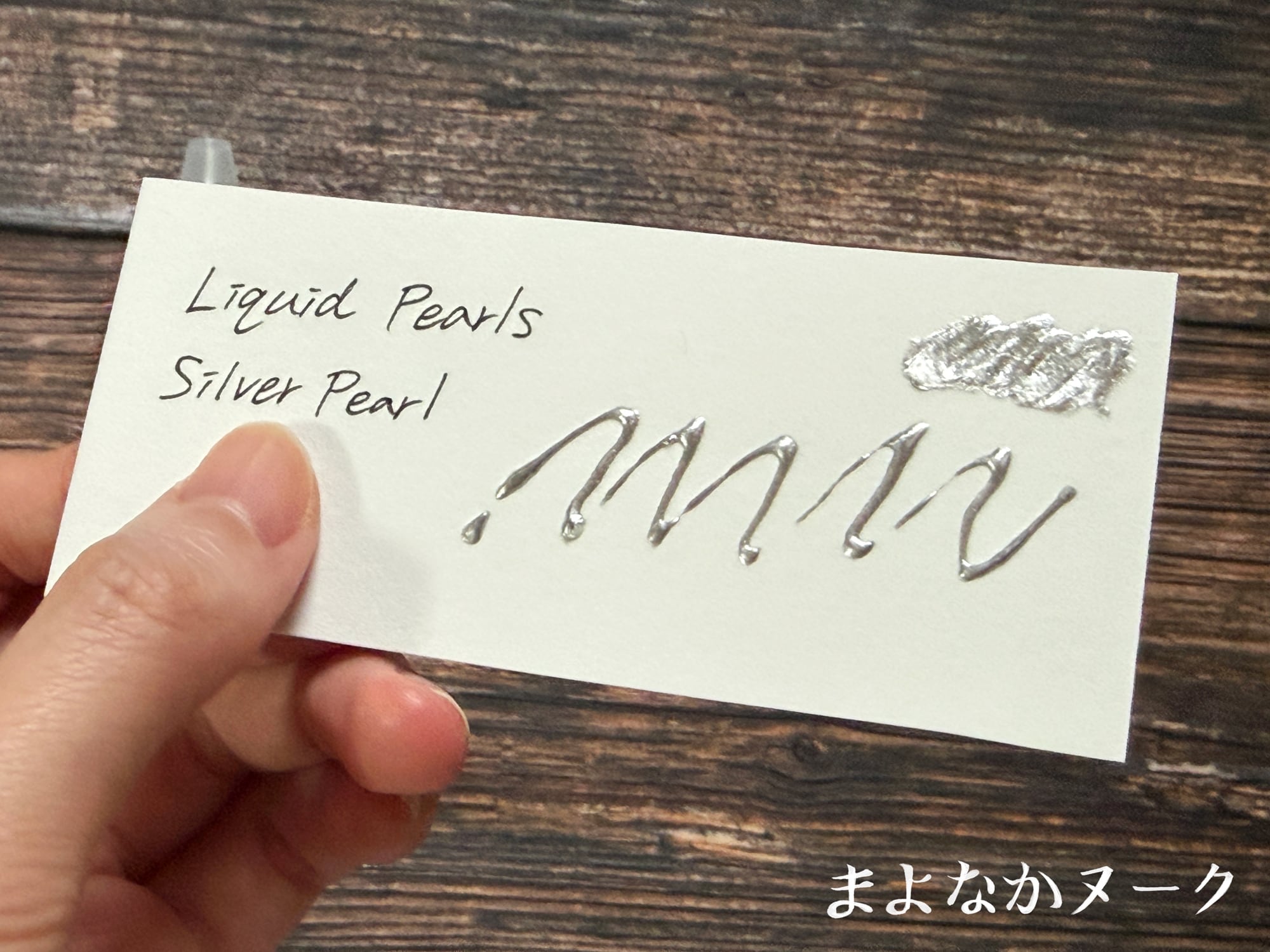 リキッドパールは、紙や布などの表面に立体的なパールの光沢感を塗布できる顔料絵具です。作品に立体的なアクセントを付けたり、ブラシで薄く伸ばしたり、水を加えて水彩絵具のように着色することもできます。こちらの色は「Silver Pearl」です。
