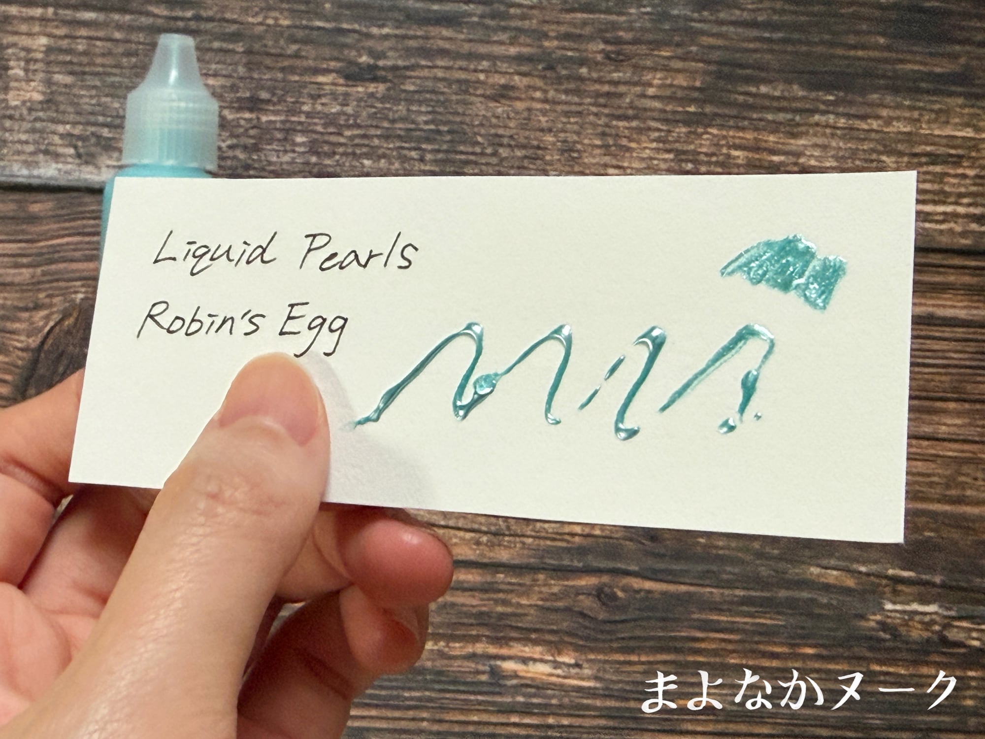 リキッドパールは、紙や布などの表面に立体的なパールの光沢感を塗布できる顔料絵具です。作品に立体的なアクセントを付けたり、ブラシで薄く伸ばしたり、水を加えて水彩絵具のように着色することもできます。こちらの色は「Robin's Egg」です。
