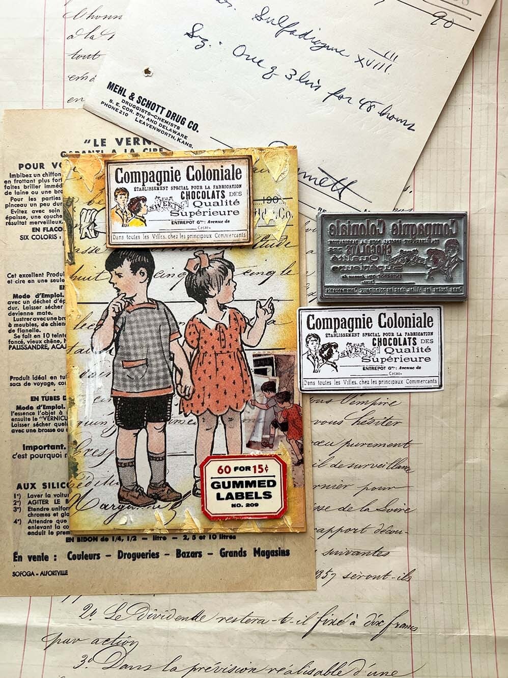 アクリルブロックに貼り付けて使うスタンプになっています。ラフな雰囲気を出したい場合は、アクリルブロックを使わず手でぺたっと押すのもおすすめです。ヴィンテージのチョコレート広告を再現した、エフェメラ作りにもぴったりのデザイン。