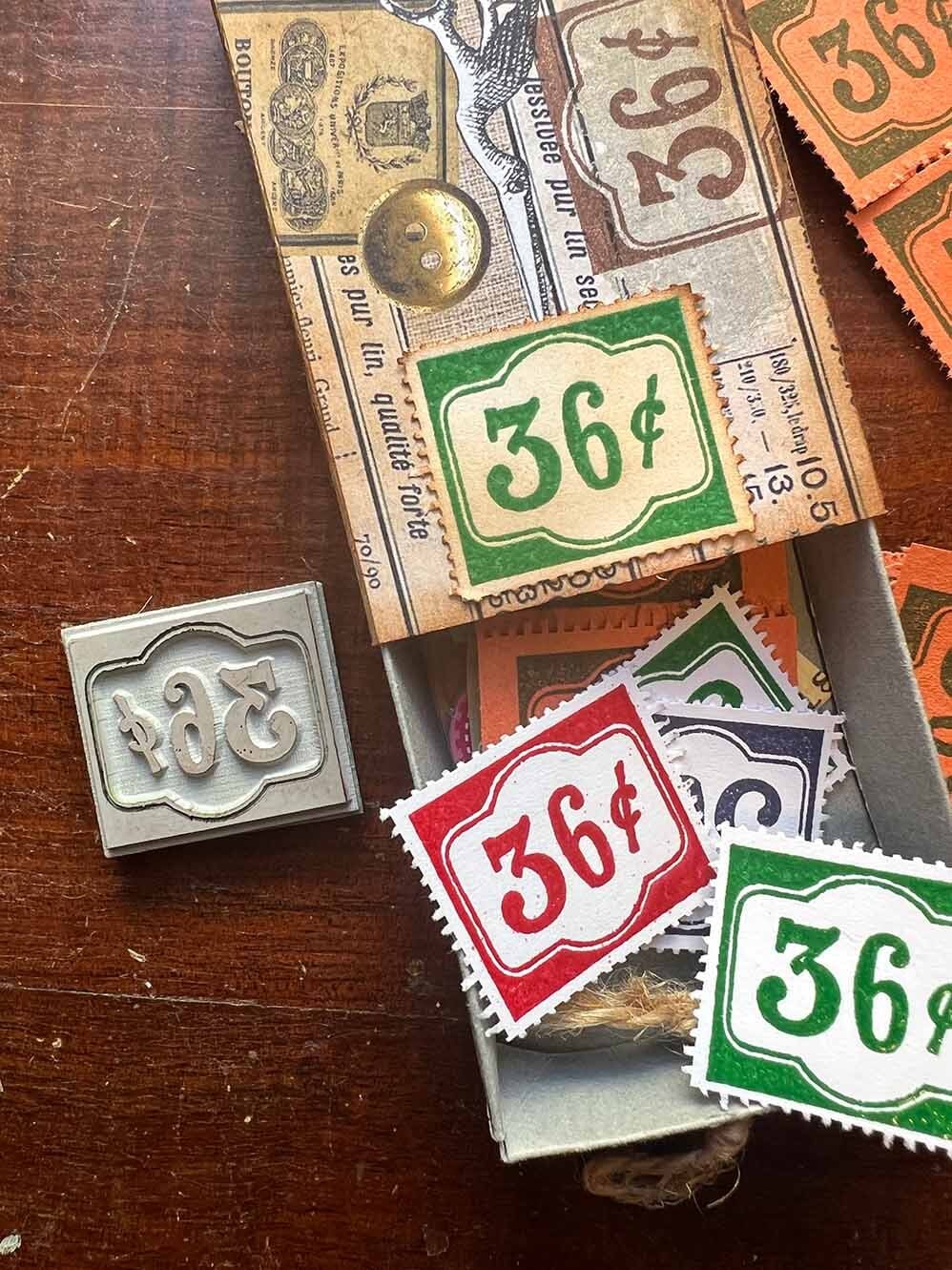 アクリルブロックに貼り付けて使うスタンプになっています。ラフな雰囲気を出したい場合は、アクリルブロックを使わず手でぺたっと押すのもおすすめです。レトロな価格ラベルを再現したデザインは、アクセントやエフェメラ作りにもぴったり。