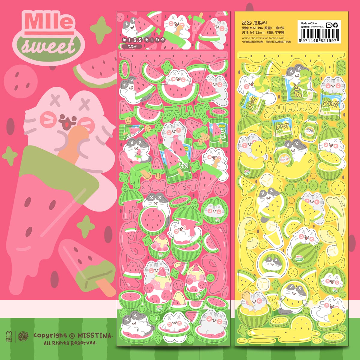ポップでキュートなデザインと色使いが特徴の「MISSTINA」のシールです。デザインの異なる2枚のシートがセットになっています。オーロラのようにほんのりと虹色に光ります。