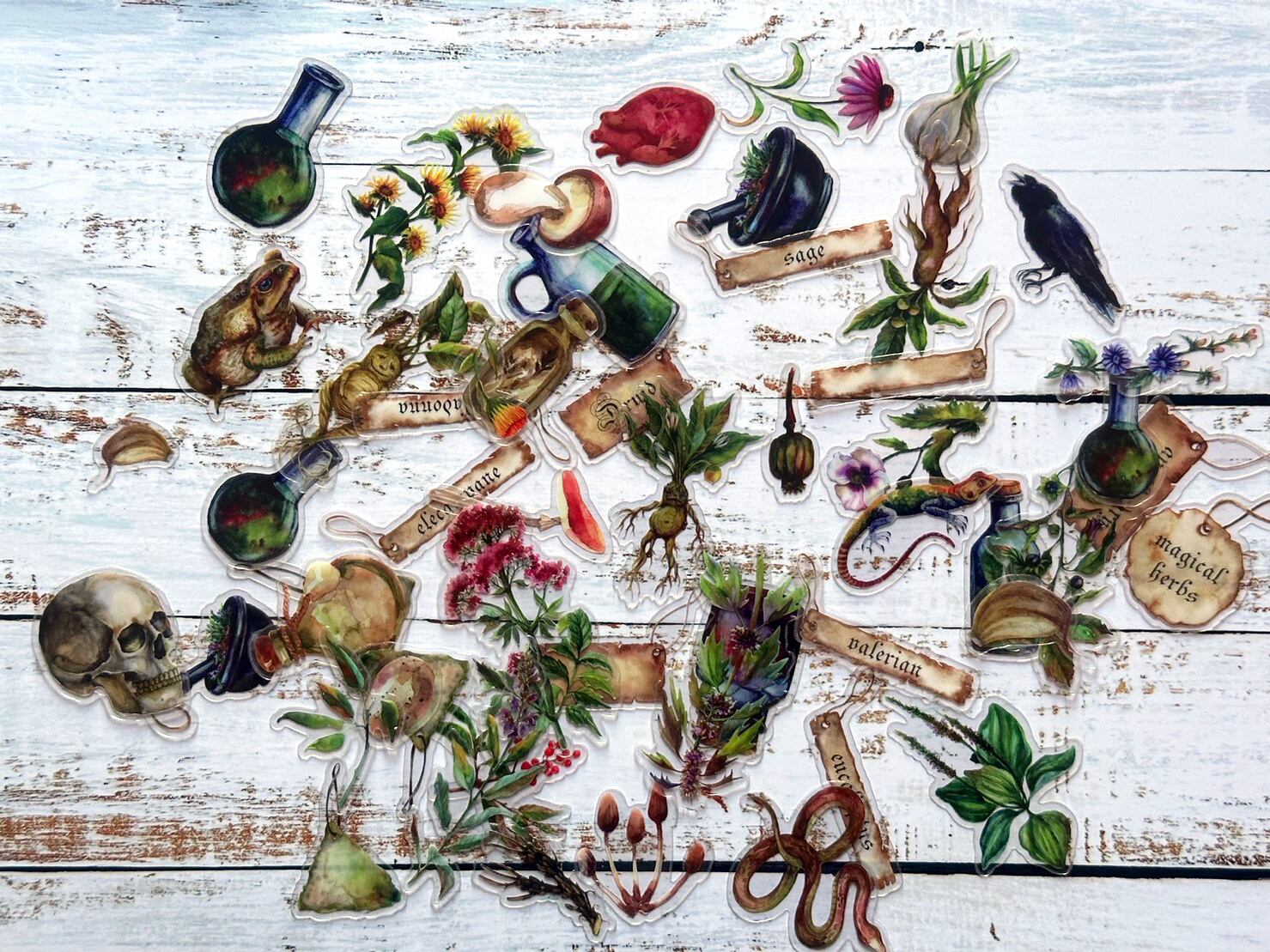 ブリキ缶にはたっぷり55種類ものPETシールが入っています。まるで魔法使いの庭にあるような、植物やボトル、生き物たち、ラベルなどのモチーフ。中にはマンドラゴラやドクロなど、ミステリアスなデザインも。こういった雰囲気がお好きな方にはぜひおすすめしたい一品です。