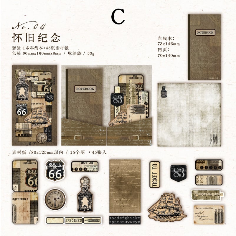 雰囲気のあるペーパーフォルダのようなパッケージに、ヴィンテージ風のノートと素材紙が収納されています。ノートは中にもデザインが入っている凝った仕様。セットをまとめて収納できるのが嬉しいですね。コラージュ、ジャンクジャーナル、手帳デコ、その他様々なクラフト作品やラッピングなどに。