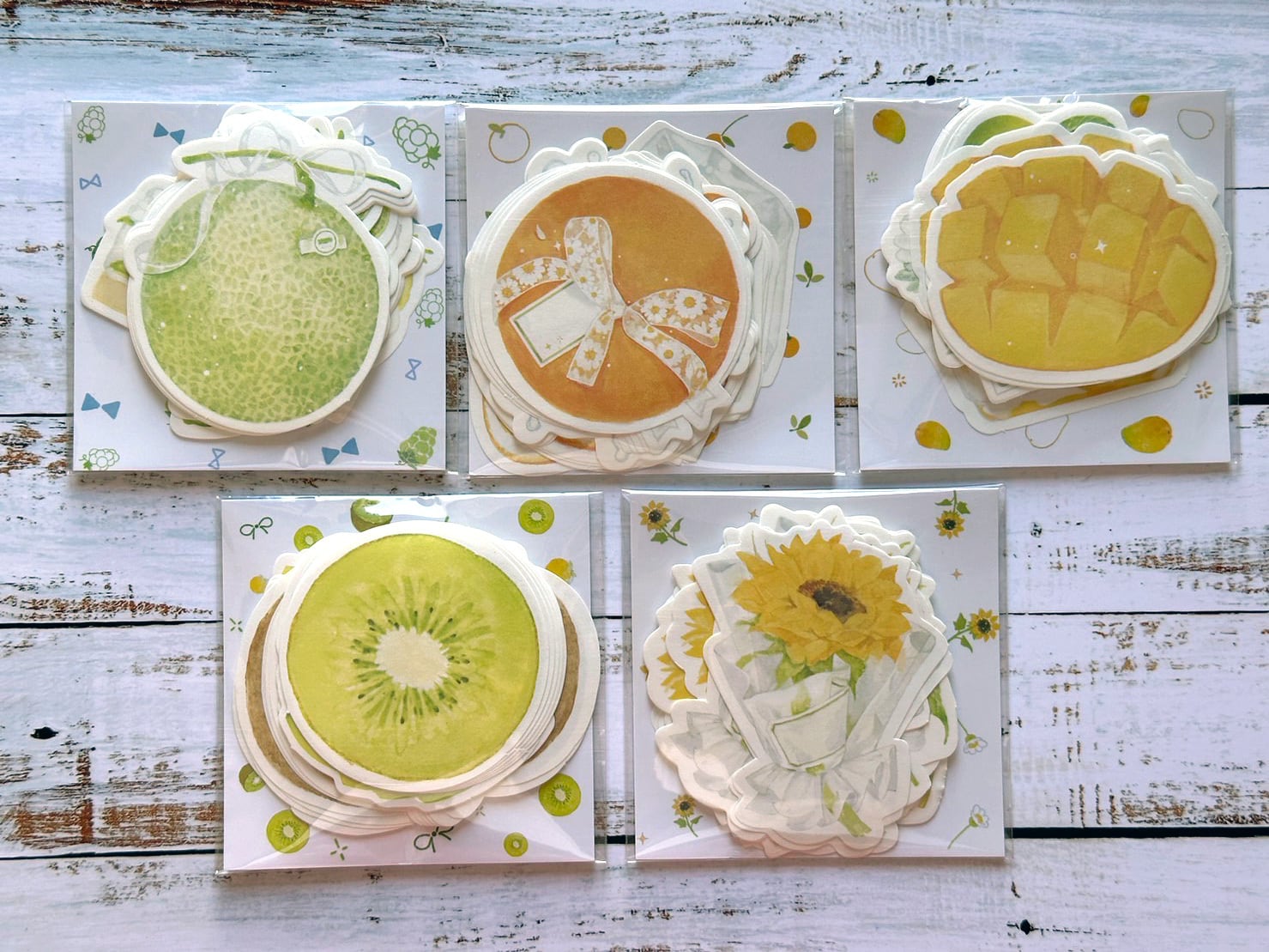 夏らしい鮮やかな色合いの果実や花がとても瑞々しく素敵なデザインです。裏面にちょっとしたお手紙を書いたり、コラージュ素材として使うのもおすすめ。それぞれのデザインが6枚ずつ入っているのも嬉しいですね。コラージュ、ジャンクジャーナル、手帳デコ、その他様々なクラフト作品やラッピングなどに。