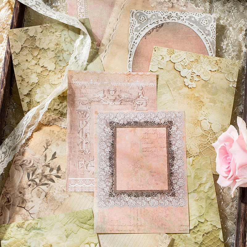 くすんだ色合いのレースが優雅で上品なデザインです。そのまま貼ってコラージュなどの背景にしたり、ちぎったり、好きなようにお使いいただけます。コラージュ、ジャンクジャーナル、手帳デコ、その他様々なクラフト作品やラッピングなどに。