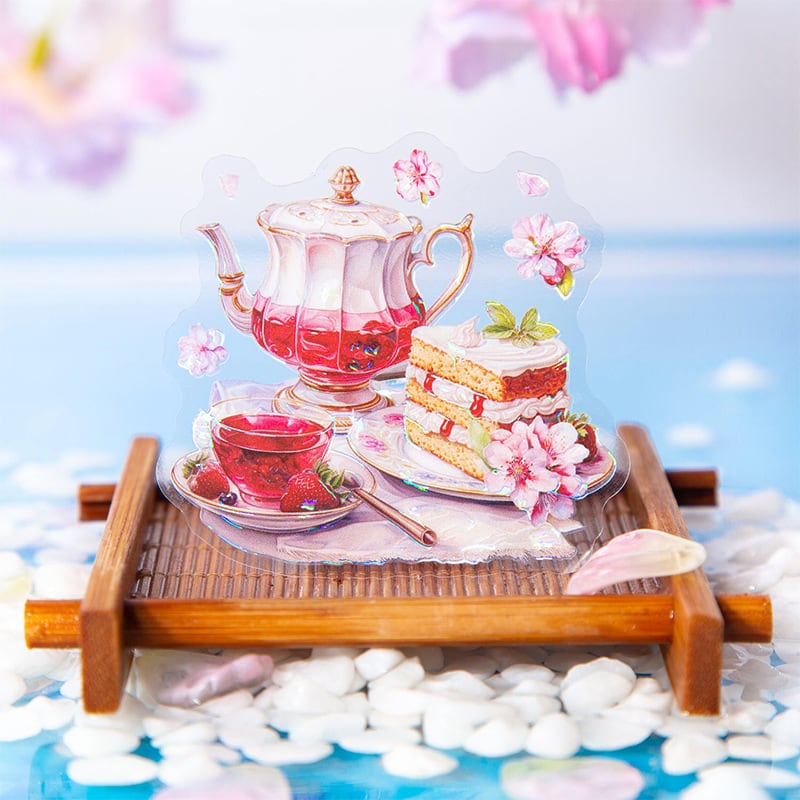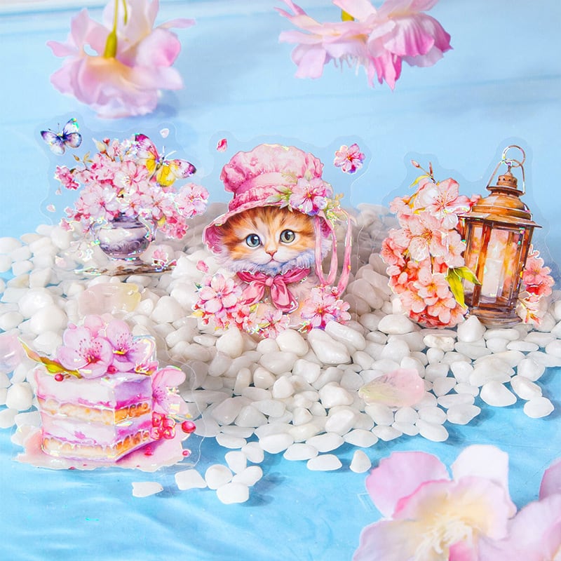 華やかなテイストの桜モチーフです。スイーツや猫などの可愛らしいモチーフが桜と一緒に描かれています。シェルライトのホログラムがきらきら輝きます!コラージュ、ジャンクジャーナル、手帳デコ、その他様々なクラフト作品やラッピングなどに。