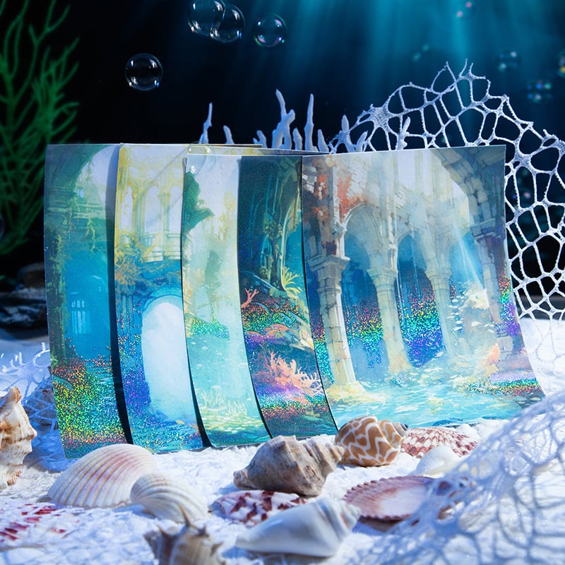 幻想的な海の中の世界は、物語を感じさせるわくわくするような雰囲気です。きらきらの銀河光ホログラムも、まるで海中のきらめきを再現しているかのよう。コラージュ、ジャンクジャーナル、手帳デコ、その他様々なクラフト作品やラッピングなどに。
