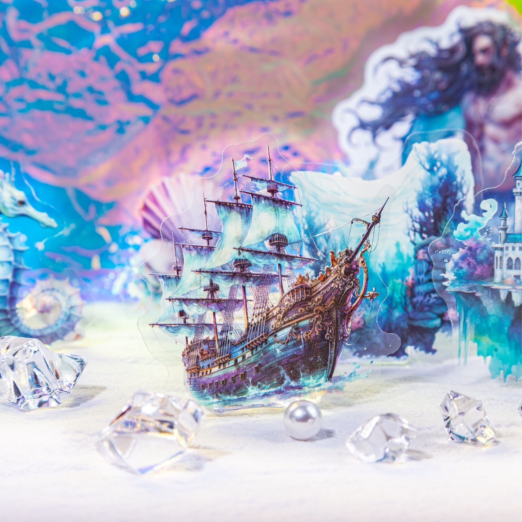 鮮やかな色彩で描かれた人魚や海のモチーフが幻想的で素敵なデザインです。同じデザインでPETと紙のシールが1枚ずつ入ったセットになっています。ファンタジー好きな方に特におすすめ!コラージュ、ジャンクジャーナル、手帳デコ、その他様々なクラフト作品やラッピングなどに。
