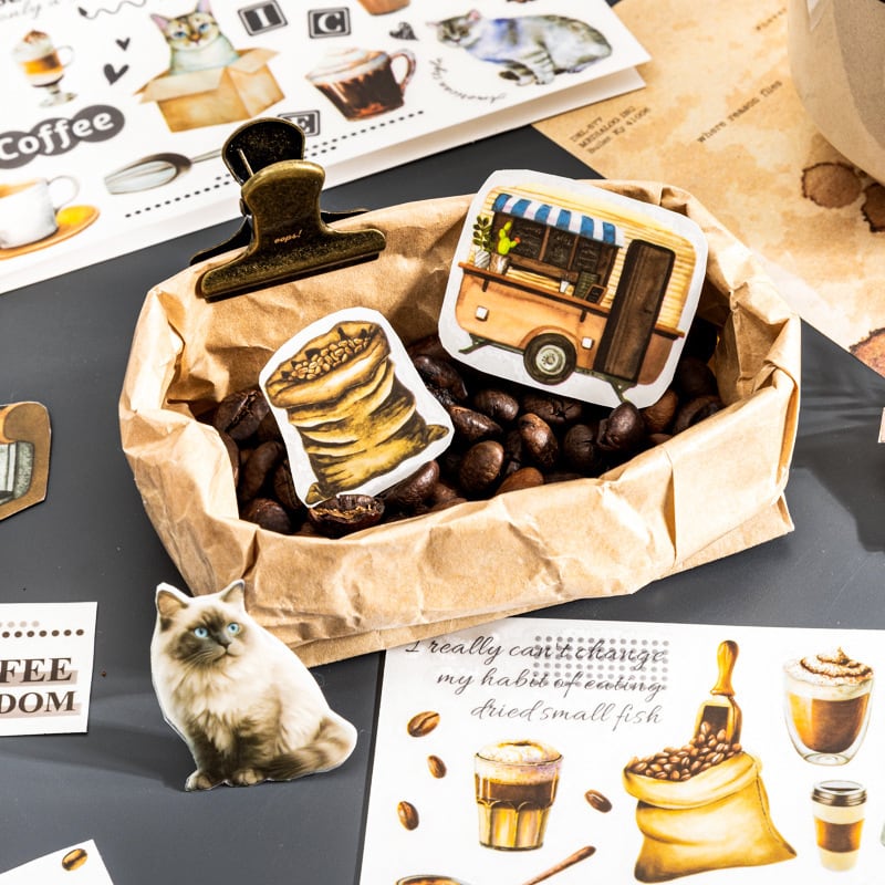 可愛い猫ちゃんとコーヒーやスイーツなどのほっこりする組み合わせが素敵なデザインです。転写シールなので、紙だけでなく色々な表面に貼って楽しむことができます。コラージュ、ジャンクジャーナル、手帳デコ、その他様々なクラフト作品やラッピングなどに。